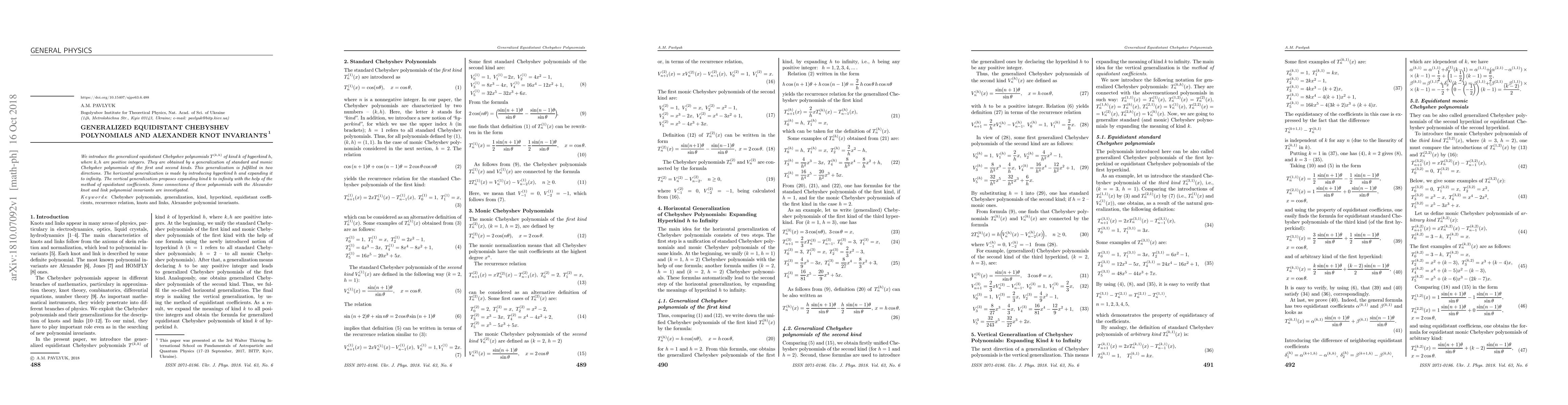 This paper introduces generalized equidistant Chebyshev polynomials T(k,h) of kind k and hyperkind h, extending standard Chebyshev polynomials. It explores connections between these polynomials and Alexander knot invariants.