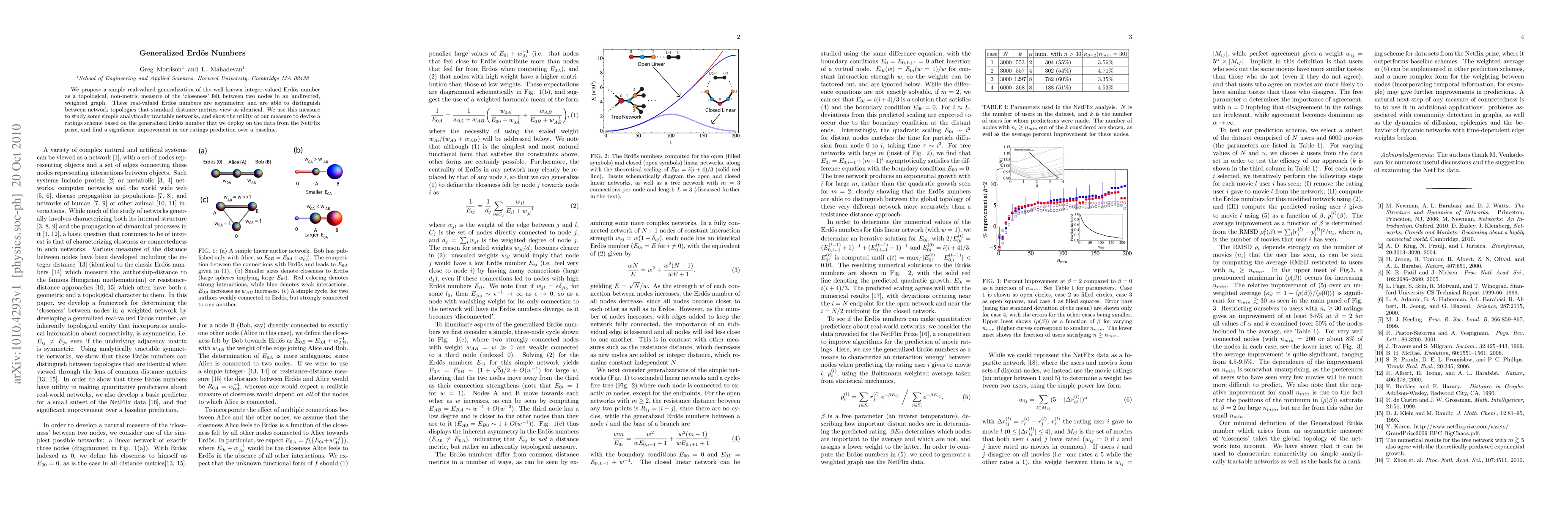 We propose a simple real-valued generalization of the well known integer-valued Erdos number as a topological, non-metric measure of the `closeness' felt between two nodes in an undirected, weighted graph. These real-valued Erdos numbers are asymmetric and are able to distinguish between network topologies that standard distance metrics view as identical. We use this measure to study some simple analytically tractable networks, and show the utility of our measure to devise a ratings scheme based on the generalized Erdos number that we deploy on the data from the NetFlix prize, and find a significant improvement in our ratings prediction over a baseline.
