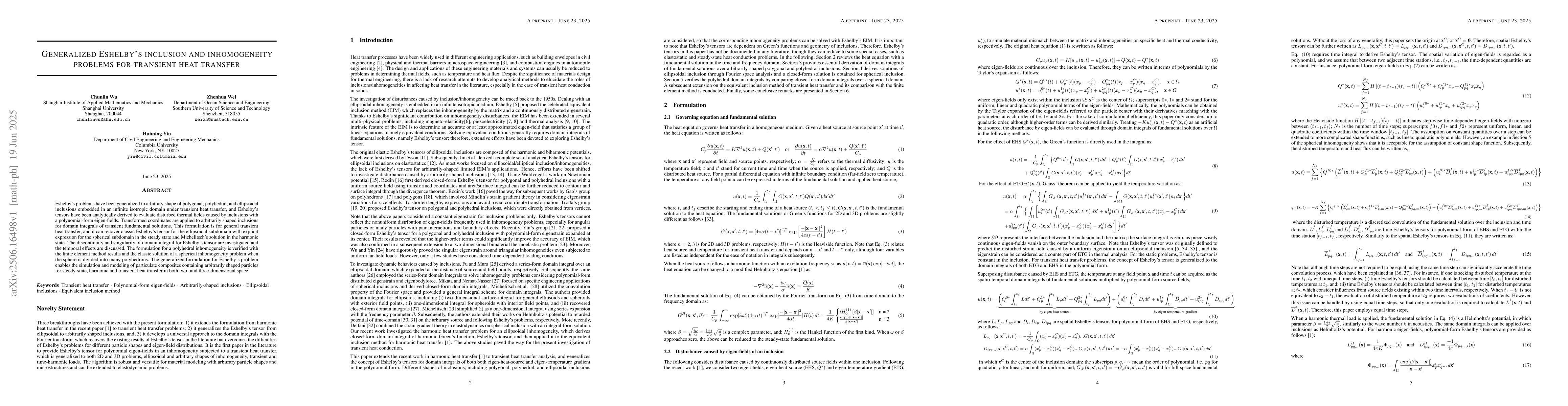 This research generalizes Eshelby's inclusion problems to arbitrarily shaped inclusions (polygonal, polyhedral, ellipsoidal) in transient heat transfer, deriving analytical Eshelby tensors for disturbed thermal fields. The method uses transformed coordinates for domain integrals, verifying its accuracy via comparison with finite element results and classic solutions. It facilitates modeling of complex particulate composites in steady-state, harmonic, and transient heat transfer in 2D and 3D spaces.