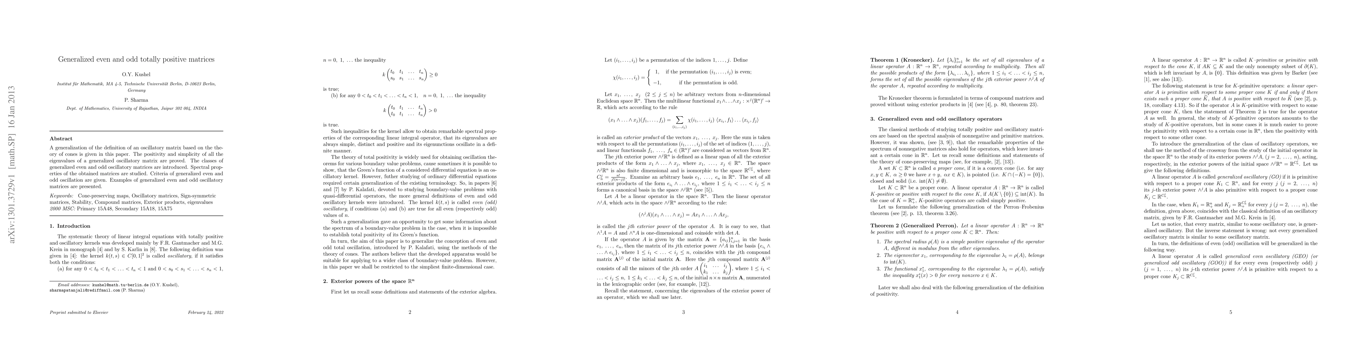A generalization of the definition of an oscillatory matrix based on the theory of cones is given in this paper. The positivity and simplicity of all the eigenvalues of a generalized oscillatory matrix are proved. The classes of generalized even and odd oscillatory matrices are introduced. Spectral properties of the obtained matrices are studied. Criteria of generalized even and odd oscillation are given. Examples of generalized even and odd oscillatory matrices are presented.