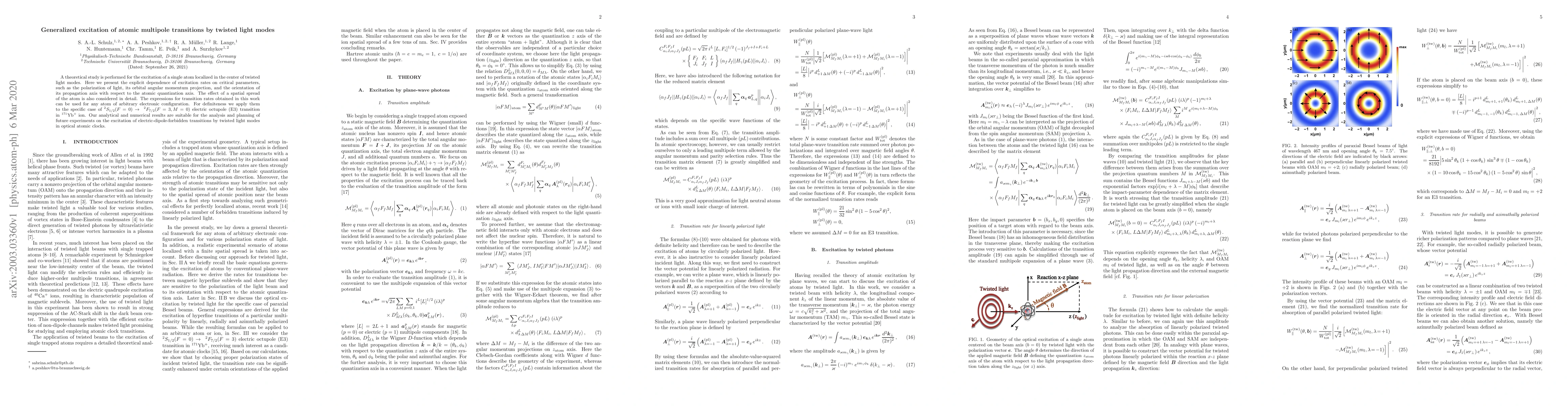 This paper theoretically investigates the excitation of atomic multipole transitions using twisted light modes, focusing on the dependence of excitation rates on light polarization, orbital angular momentum, and spatial atom distribution. The study provides general expressions for transition rates applicable to any atom, exemplified by an octupole transition in the $^{171}$Yb$^{+}$ ion, aiding future experiments in optical atomic clocks.