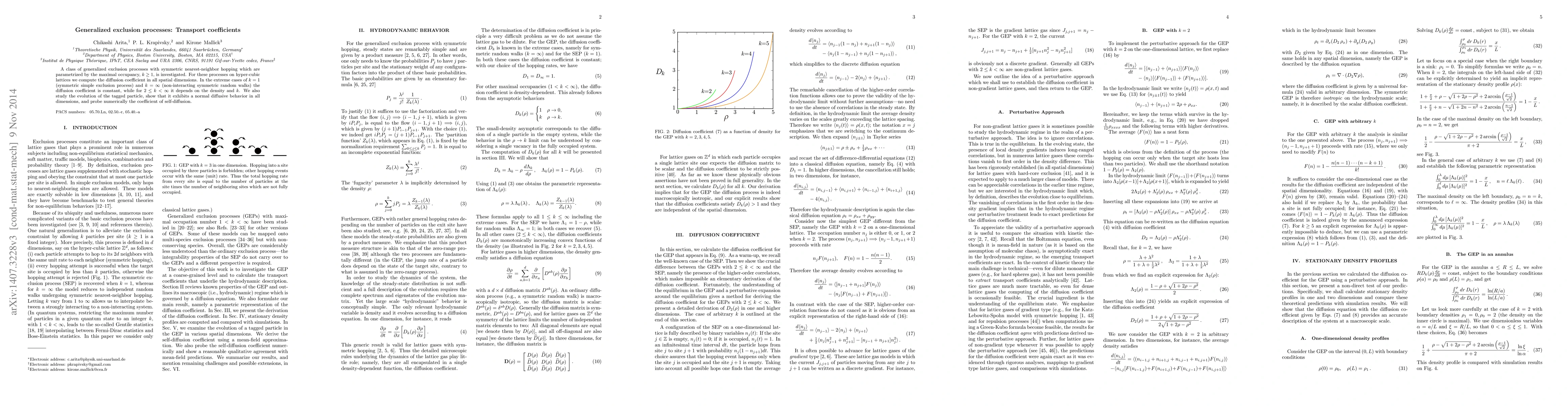 This paper investigates generalized exclusion processes with varying maximal occupancy, computing the diffusion coefficient which is independent of spatial dimension. For $k=1$ and $k=\infty$, the diffusion coefficient is constant, while for $2\leq k<\infty$, it depends on density and occupancy $k$. The study also numerically examines the self-diffusion coefficient of a tagged particle.