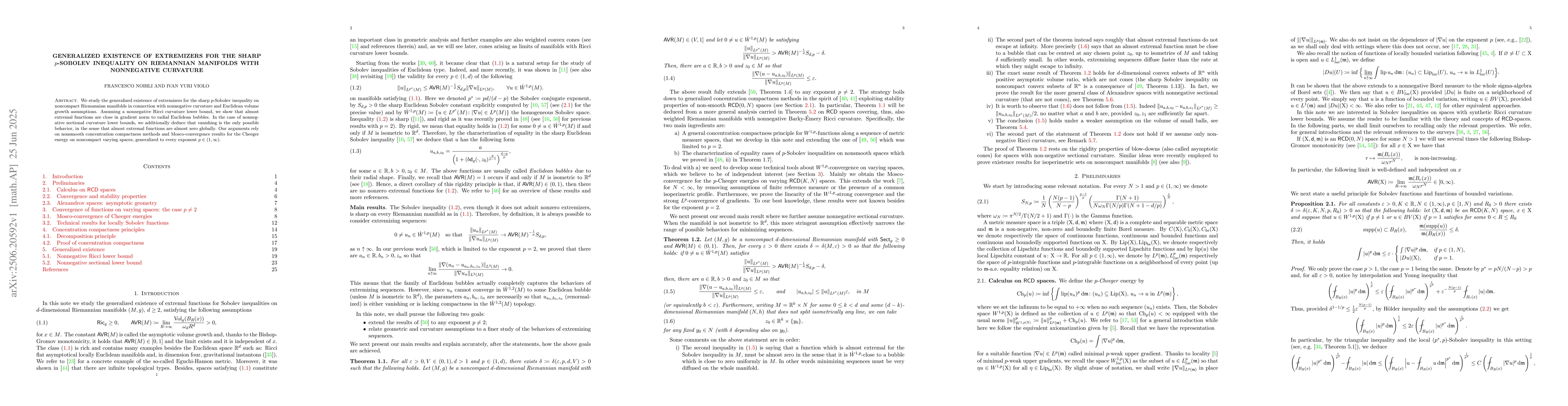We study the generalized existence of extremizers for the sharp $p$-Sobolev inequality on noncompact Riemannian manifolds in connection with nonnegative curvature and Euclidean volume growth assumptions. Assuming a nonnegative Ricci curvature lower bound, we show that almost extremal functions are close in gradient norm to radial Euclidean bubbles. In the case of nonnegative sectional curvature lower bounds, we additionally deduce that vanishing is the only possible behavior, in the sense that almost extremal functions are almost zero globally. Our arguments rely on nonsmooth concentration compactness methods and Mosco-convergence results for the Cheeger energy on noncompact varying spaces, generalized to every exponent $p\in (1,\infty)$.
