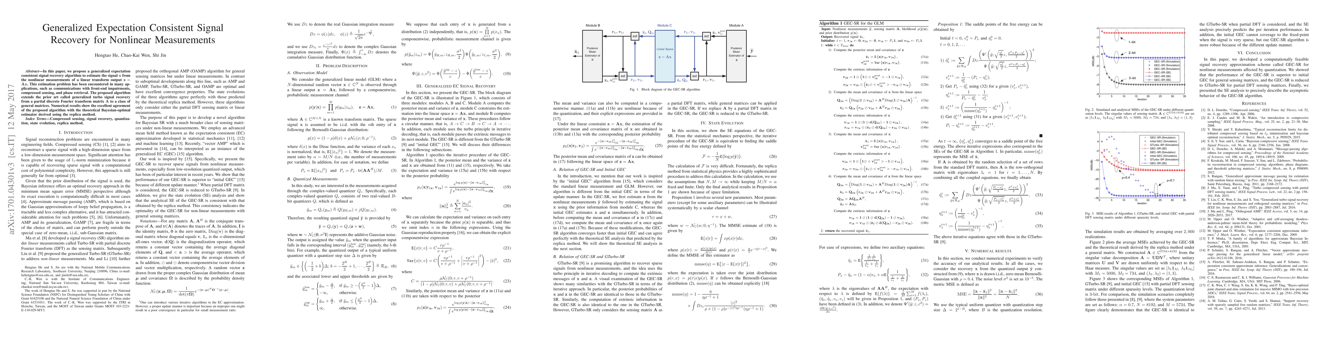 This paper introduces a generalized expectation consistent signal recovery algorithm for estimating signals from nonlinear measurements of linear transforms. The algorithm extends prior methods to a broader class of matrices, demonstrating strong performance in applications like communications and compressed sensing.