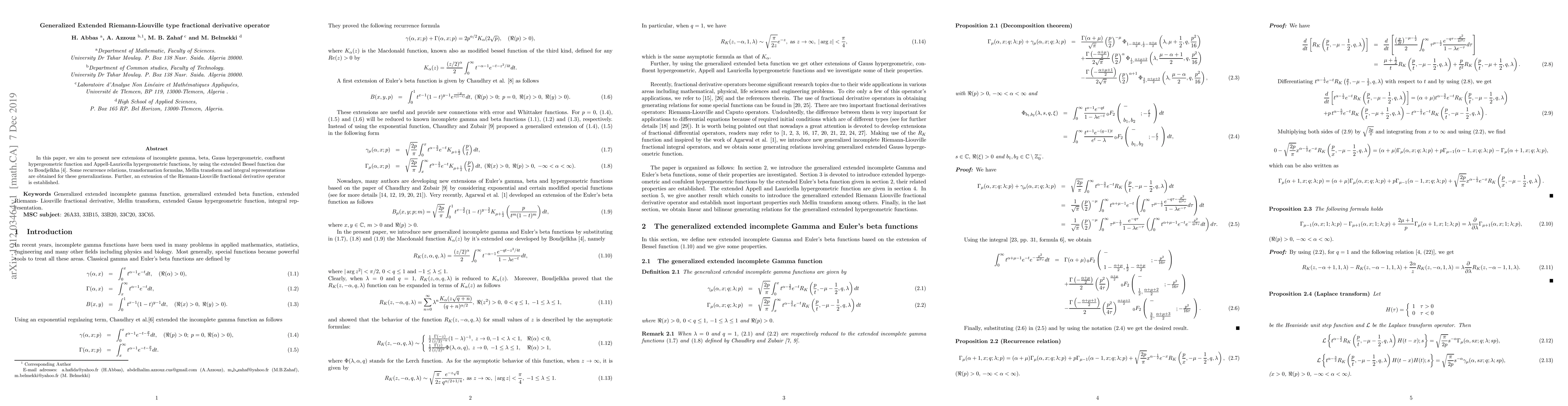 This paper introduces new extensions of several special functions using the extended Bessel function, deriving recurrence relations, transformation formulas, and integral representations. It also extends the Riemann-Liouville fractional derivative operator.