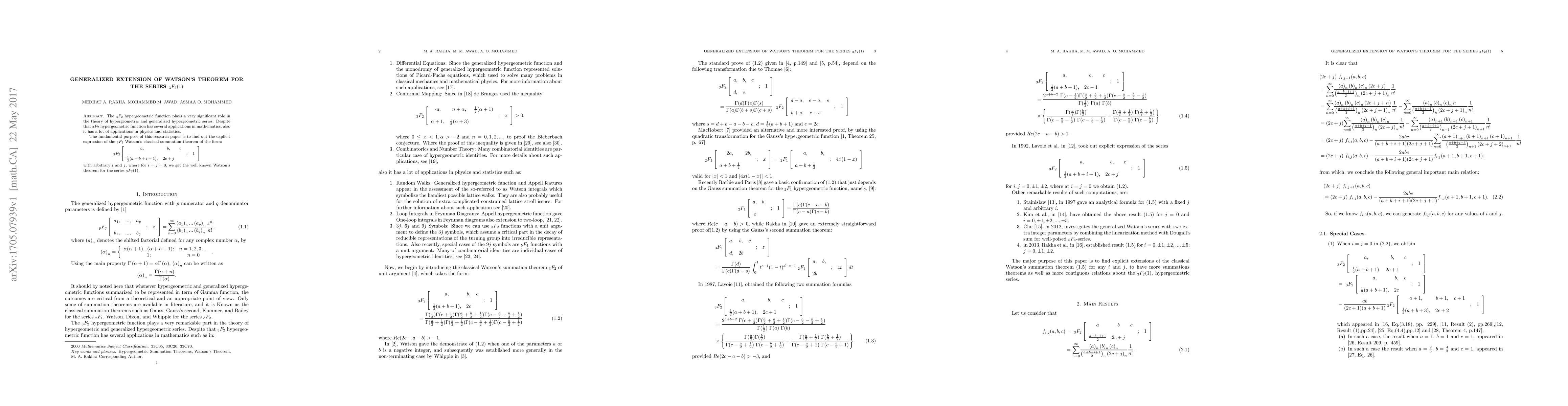 The $_{3}F_{2}$ hypergeometric function plays a very significant role in the theory of hypergeometric and generalized hypergeometric series. Despite that $_{3}F_{2}$ hypergeometric function has several applications in mathematics, also it has a lot of applications in physics and statistics. The fundamental purpose of this research paper is to find out the explicit expression of the $_{3}F_{2}$ Watson's classical summation theorem of the form: \[ _{3}F_{2}\left[ \begin{array} [c]{ccccc}% a, & b, & c & & \\ & & & ; & 1\\ \frac{1}{2}(a+b+i+1), & 2c+j & & & \end{array} \right] \] with arbitrary $i$ and $j$, where for $i=j=0$, we get the well known Watson's theorem for the series $_{3}F_{2}(1)$.