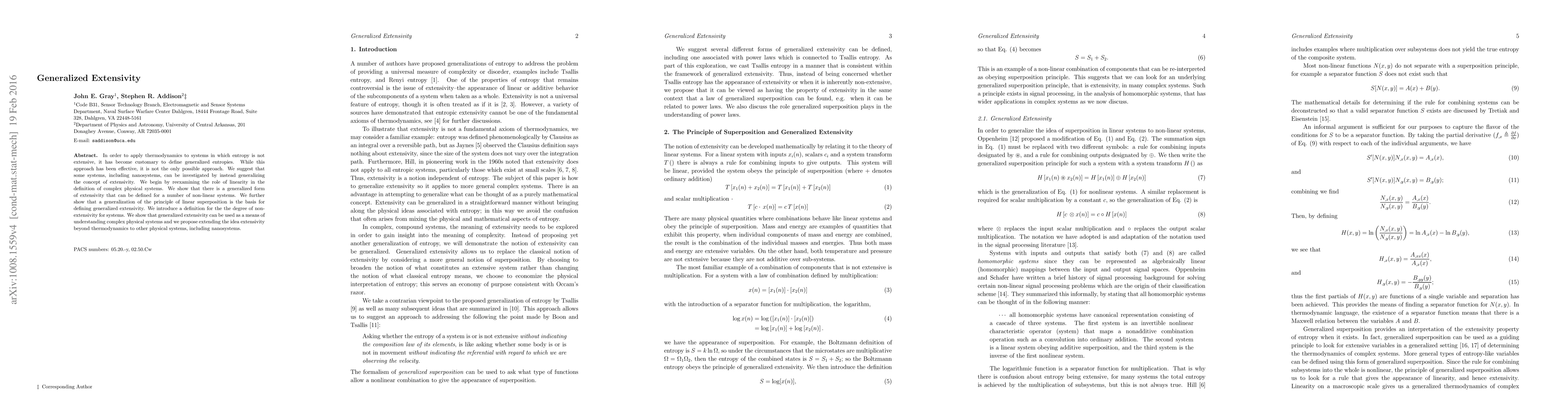 In order to apply thermodynamics to systems in which entropy is not extensive, it has become customary to define generalized entropies. While this approach has been effective, it is not the only possible approach. We suggest that some systems, including nanosystems, can be investigated by instead generalizing the concept of extensivity. We begin by reexamining the role of linearity in the definition of complex physical systems. We show that there is a generalized form of extensivity that can be defined for a number of non-linear systems. We further show that a generalization of the principle of linear superposition is the basis for defining generalized extensivity. We introduce a definition for the the degree of non-extensivity for systems. We show that generalized extensivity can be used as a means of understanding complex physical systems and we propose extending the idea extensivity beyond thermodynamics to other physical systems, including nanosystems.