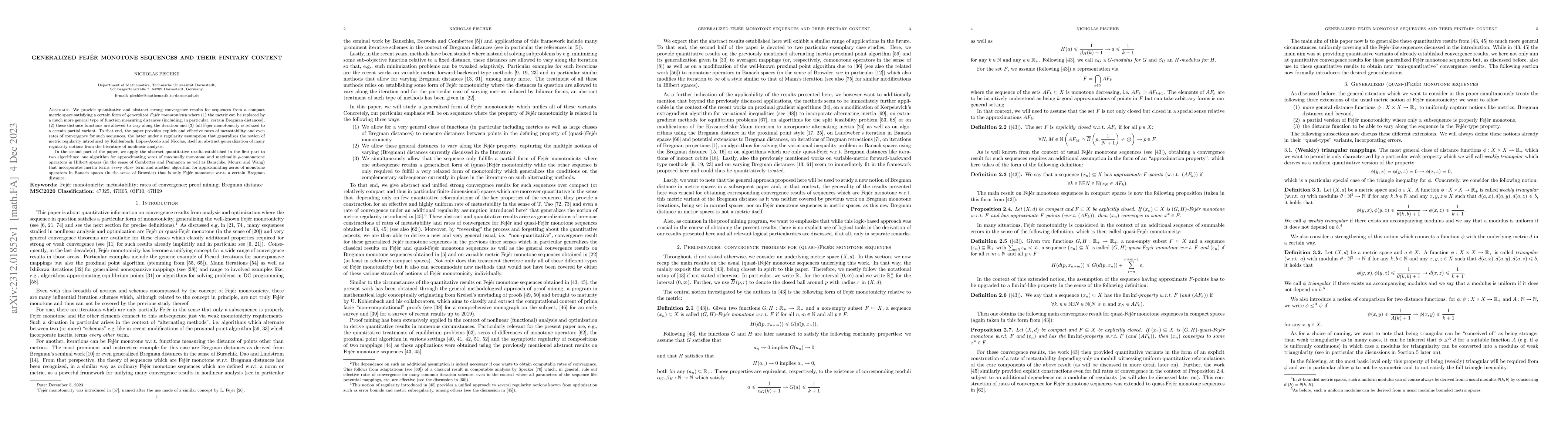 We provide quantitative and abstract strong convergence results for sequences from a compact metric space satisfying a certain form of generalized Fej\'er monotonicity where (1) the metric can be replaced by a much more general type of function measuring distances (including, in particular, certain Bregman distances), (2) these distance functions are allowed to vary along the iteration and (3) full Fej\'er monotonicity is relaxed to a certain partial variant. To that end, the paper provides explicit and effective rates of metastability and even rates of convergence for such sequences, the latter under a regularity assumption that generalizes the notion of metric regularity introduced by Kohlenbach, L\'opez-Acedo and Nicolae, itself an abstract generalization of many regularity notions from the literature of nonlinear analysis. In the second part of the paper, we apply the abstract quantitative results established in the first part to two algorithms: one algorithm for approximating zeros of maximally monotone and maximally $\rho$-comonotone operators in Hilbert spaces (in the sense of Combettes and Pennanen as well as Bauschke, Moursi and Wang) that incorporates inertia terms every other term and another algorithm for approximating zeros of monotone operators in Banach spaces (in the sense of Browder) that is only Fej\'er monotone w.r.t. a certain Bregman distance.