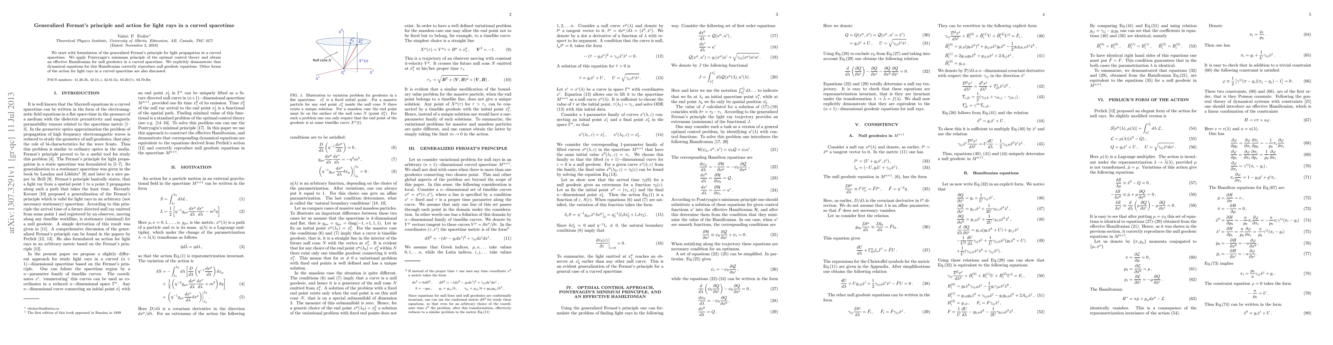 This paper formulates the generalized Fermat's principle for light in curved spacetime and uses Pontryagin's minimum principle to derive an effective Hamiltonian for null geodesics, demonstrating its equivalence to the null geodesic equations. It also explores alternative actions for light rays in such contexts.