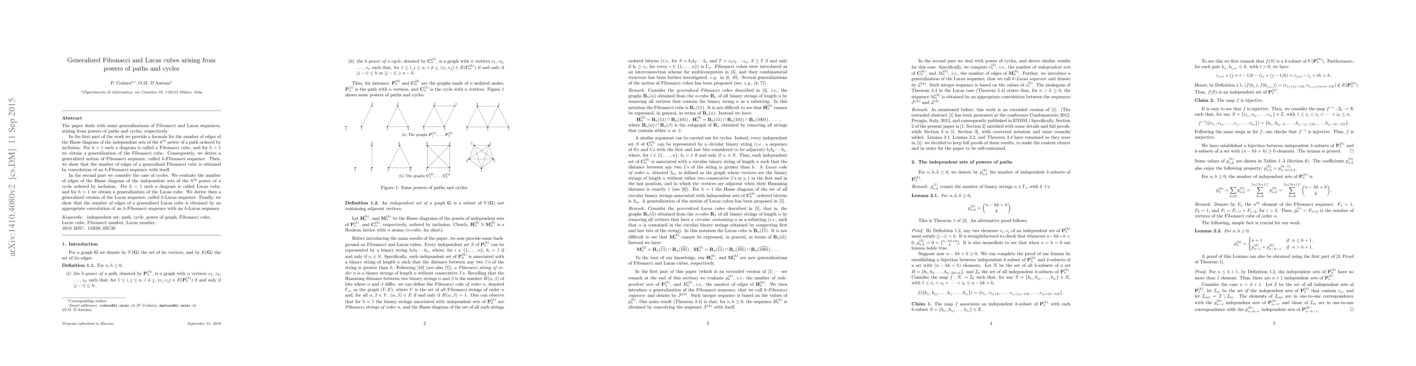 The paper deals with some generalizations of Fibonacci and Lucas sequences, arising from powers of paths and cycles, respectively. In the first part of the work we provide a formula for the number of edges of the Hasse diagram of the independent sets of the h-th power of a path ordered by inclusion. For h=1 such a diagram is called a Fibonacci cube, and for h>1 we obtain a generalization of the Fibonacci cube. Consequently, we derive a generalized notion of Fibonacci sequence, called h-Fibonacci sequence. Then, we show that the number of edges of a generalized Fibonacci cube is obtained by convolution of an h-Fibonacci sequence with itself. In the second part we consider the case of cycles. We evaluate the number of edges of the Hasse diagram of the independent sets of the hth power of a cycle ordered by inclusion. For h=1 such a diagram is called Lucas cube, and for h>1 we obtain a generalization of the Lucas cube. We derive then a generalized version of the Lucas sequence, called h-Lucas sequence. Finally, we show that the number of edges of a generalized Lucas cube is obtained by an appropriate convolution of an h-Fibonacci sequence with an h-Lucas sequence.