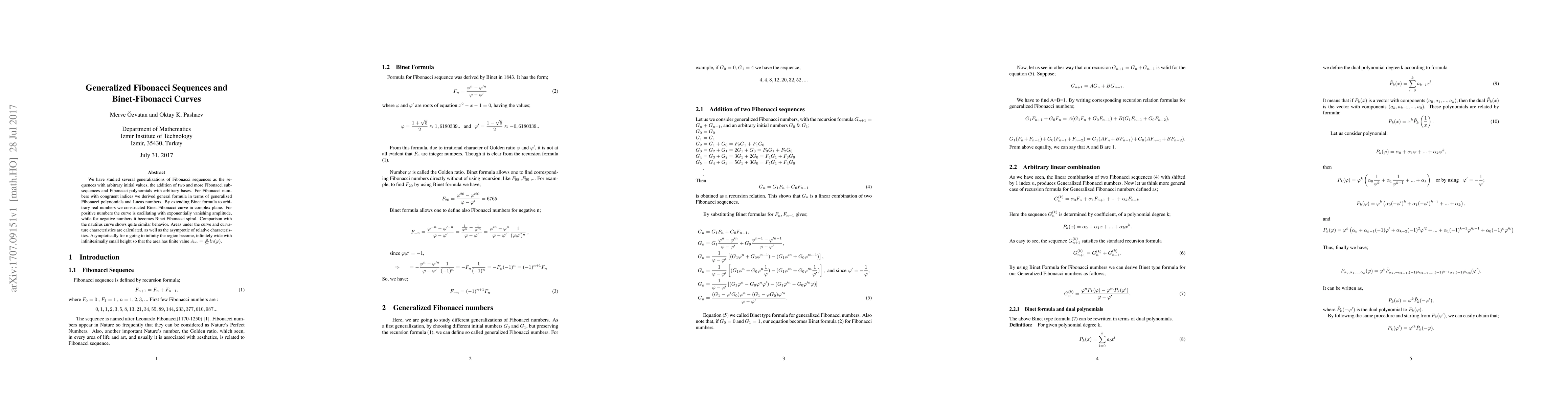 This paper explores various generalizations of Fibonacci sequences, including those with arbitrary initial values and Fibonacci polynomials. It constructs a Binet-Fibonacci curve in the complex plane, showing oscillation and spiral behavior, and compares it to the nautilus curve. The study also calculates areas under the curve and asymptotic relative characteristics, finding that the infinite area converges to $A_{\infty}=\frac{2}{5 \pi} \ln(\varphi)$.
