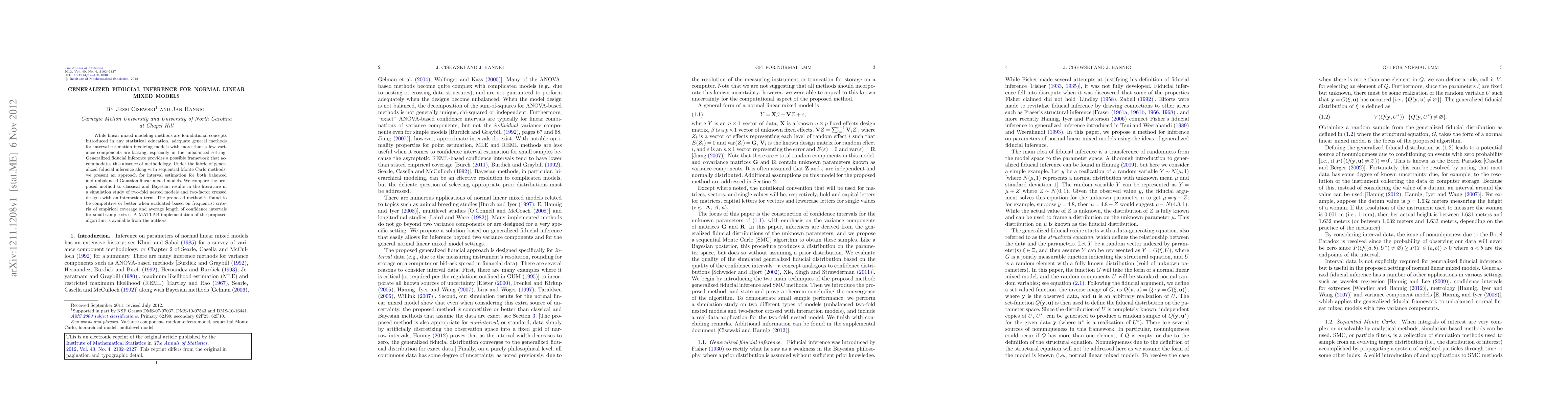 This paper proposes a generalized fiducial inference method for interval estimation in normal linear mixed models, especially for unbalanced settings. The method is compared to classical and Bayesian approaches, showing competitive or superior performance in terms of frequentist criteria, with a MATLAB implementation provided.