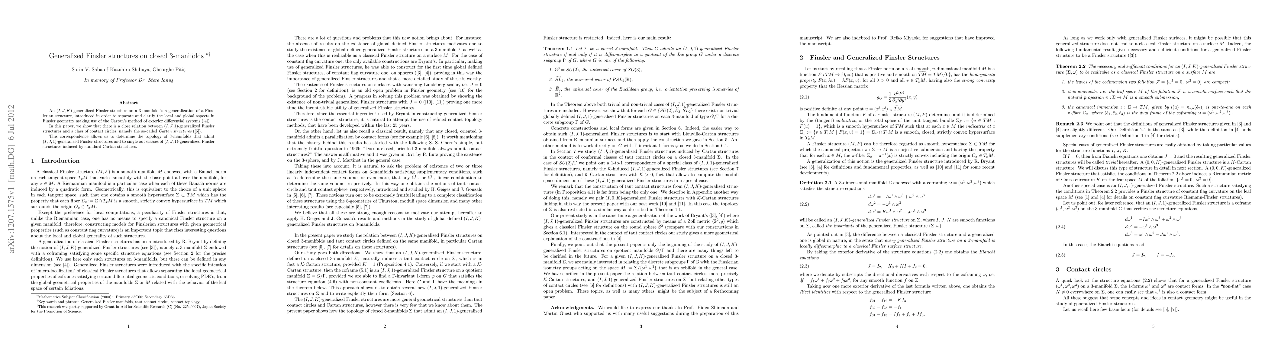 This paper explores (I,J,K)-generalized Finsler structures on 3-manifolds, linking (I,J,1)-structures to Cartan structures and contact circles, which aids in determining the topological properties of 3-manifolds with such generalized Finsler structures.