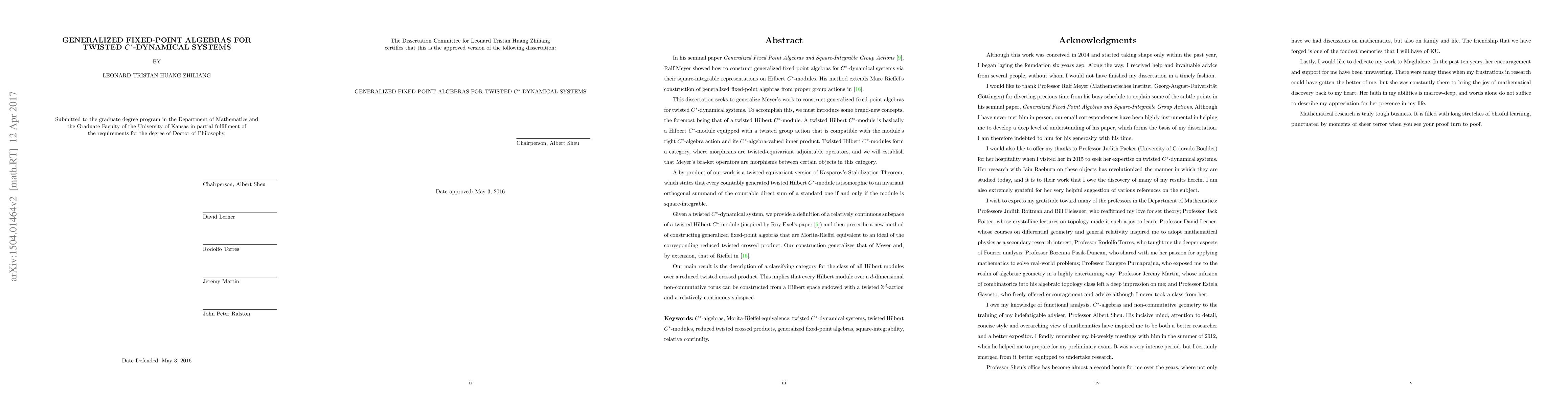 In his seminal paper "Generalized Fixed Point Algebras and Square-Integrable Group Actions", Ralf Meyer showed how to construct generalized fixed-point algebras for $ C^{\ast} $-dynamical systems via their square-integrable representations on Hilbert $ C^{\ast} $-modules. His method extends Marc Rieffel's construction of generalized fixed-point algebras from proper group actions on $ C^{\ast} $-algebras. This dissertation seeks to generalize Meyer's work to construct generalized fixed-point algebras for twisted $ C^{\ast} $-dynamical systems. To accomplish this, we must introduce some new concepts, the foremost being that of a twisted Hilbert $ C^{\ast} $-module, which is a Hilbert $ C^{\ast} $-module equipped with a twisted group action by bijective linear isometries that is compatible with the module's right $ C^{\ast} $-algebra action and its $ C^{\ast} $-algebra-valued inner product. Twisted Hilbert $ C^{\ast} $-modules over a fixed twisted $ C^{\ast} $-dynamical system form a category, where morphisms are twisted-equivariant adjointable operators. Given a twisted $ C^{\ast} $-dynamical system, we provide a definition of a relatively continuous subspace of a twisted Hilbert $ C^{\ast} $-module (inspired by an idea due to Ruy Exel), and then prescribe a method of constructing, from such a subspace, a generalized fixed-point algebra that is Morita-Rieffel equivalent to an ideal of the corresponding reduced twisted crossed product. Our construction thus generalizes that of Meyer and, by extension, that of Rieffel. Our main result is the description of a classifying category for the class of all Hilbert modules over a reduced twisted crossed product. This implies that every Hilbert module over a $ d $-dimensional non-commutative torus can be constructed from a Hilbert space endowed with a twisted $ \mathbb{Z}^{d} $-action by unitary operators and a relatively continuous subspace.