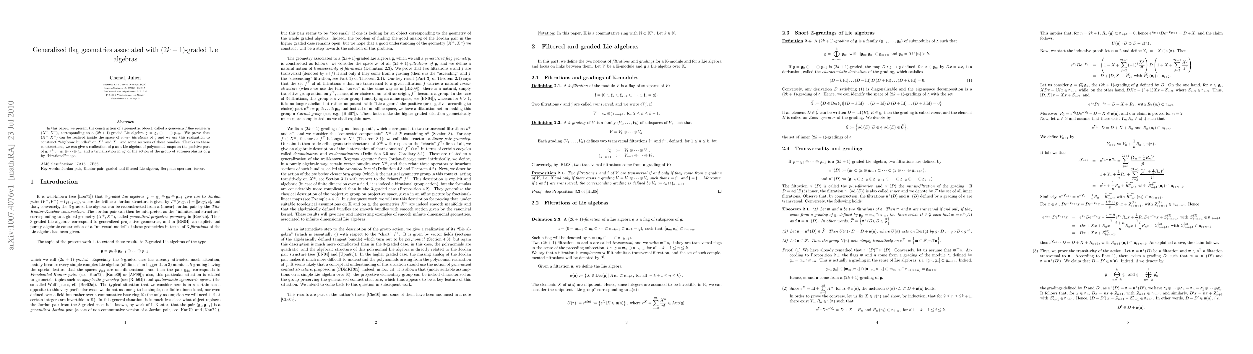 In this paper, we present the construction of a geometric object, called a generalized flag geometry, $(X^+;X^-)$, corresponding to a (2k +1)-graded Lie algebra $g=g_k\oplus\dots\oplus g_{-k}$. We prove that $(X^+;X^-) can be realized inside the space of inner filtrations of g and we use this realization to construct "algebraic bundles" on $X^+$ and $X^-$ and some sections of these bundles. Thanks to these constructions, we can give a realization of $g$ as a Lie algebra of polynomial maps on the positive part of $g$, $n^+_1:=g_1\oplus\dots\oplus g_k$, and a trivialization in $n^+_1$ of the action of the group of automorphisms of $g$ by "birational"maps.