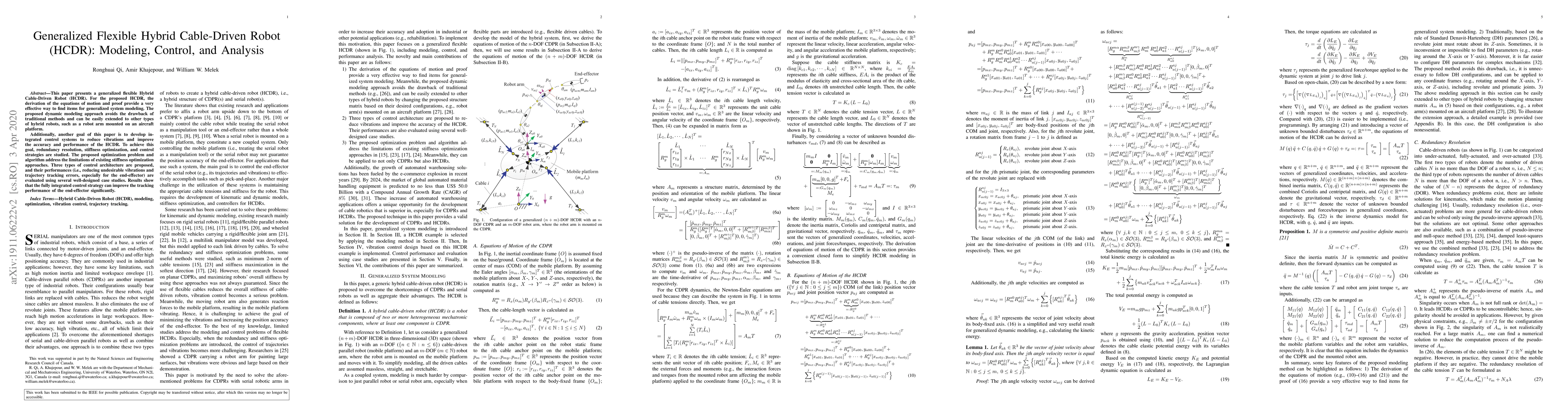 This paper presents a generalized flexible Hybrid Cable-Driven Robot (HCDR). For the proposed HCDR, the derivation of the equations of motion and proof provide a very effective way to find items for generalized system modeling. The proposed dynamic modeling approach avoids the drawback of traditional methods and can be easily extended to other types of hybrid robots, such as a robot arm mounted on an aircraft platform. Additionally, another goal of this paper is to develop integrated control systems to reduce vibrations and improve the accuracy and performance of the HCDR. To achieve this goal, redundancy resolution, stiffness optimization, and control strategies are studied. The proposed optimization problem and algorithm address the limitations of existing stiffness optimization approaches. Three types of control architecture are proposed, and their performances (i.e., reducing undesirable vibrations and trajectory tracking errors, especially for the end-effector) are evaluated using several well-designed case studies. Results show that the fully integrated control strategy can improve the tracking performance of the end-effector significantly.