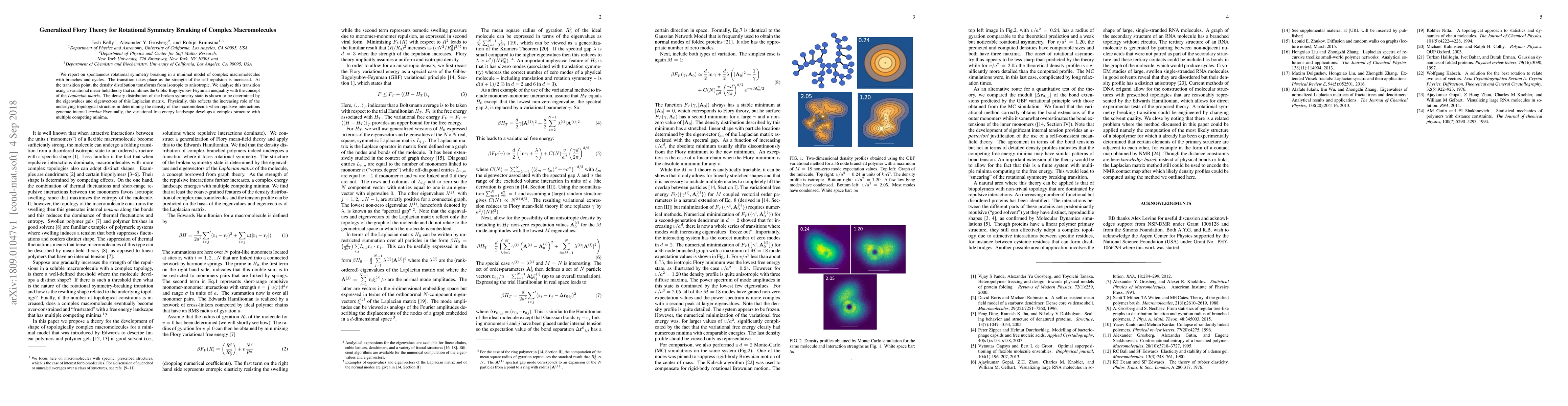 We report on spontaneous rotational symmetry breaking in a minimal model of complex macromolecules with branches and cycles. The transition takes place as the strength of the self-repulsion is increased. At the transition point, the density distribution transforms from isotropic to anisotropic. We analyze this transition using a variational mean-field theory that combines the Gibbs-Bogolyubov-Feynman inequality with the concept of the Laplacian matrix. The density distribution of the broken symmetry state is shown to be determined by the eigenvalues and eigenvectors of this Laplacian matrix. Physically, this reflects the increasing role of the underlying topological structure in determining the density of the macromolecule when repulsive interactions generate internal tension Eventually, the variational free energy landscape develops a complex structure with multiple competing minima.