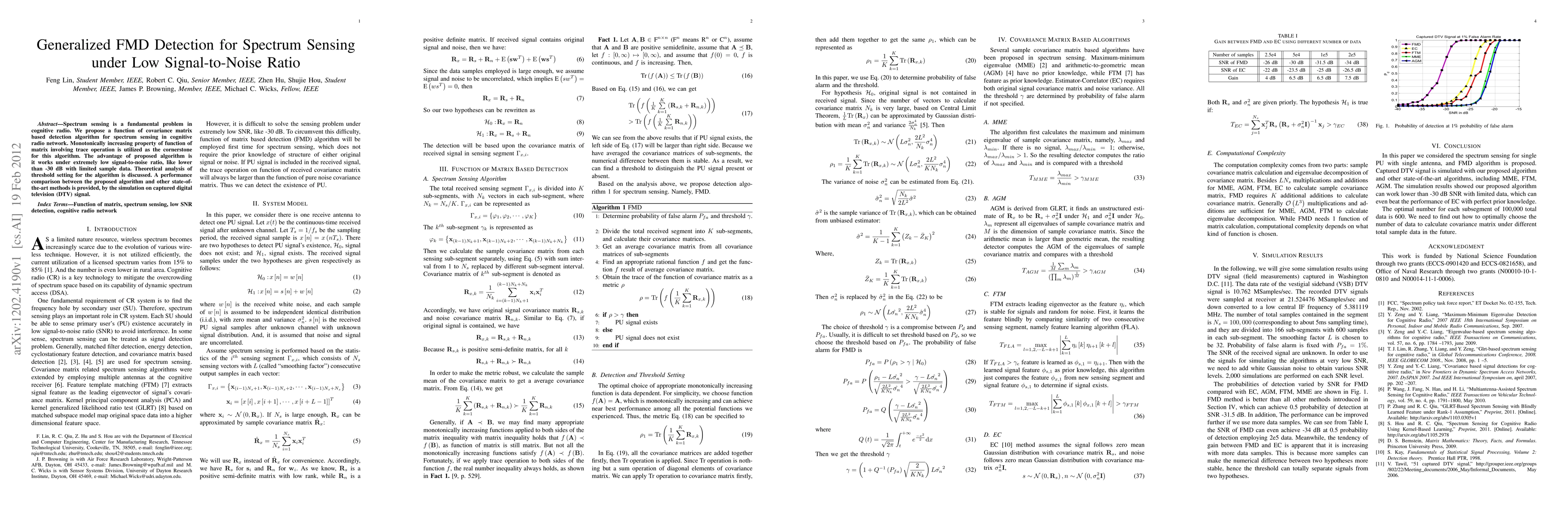 This paper proposes a novel detection algorithm for spectrum sensing in cognitive radio networks, utilizing the monotonically increasing property of a function of the covariance matrix. The algorithm is effective under extremely low signal-to-noise ratios and performs well with limited sample data, as demonstrated through theoretical analysis and simulation comparisons with state-of-the-art methods.