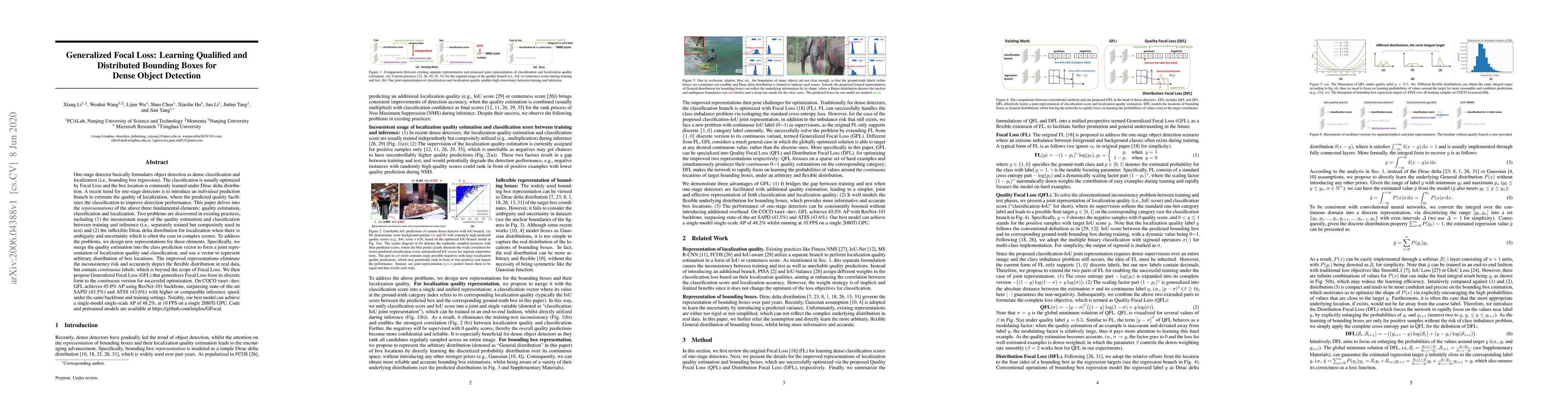 One-stage detector basically formulates object detection as dense classification and localization. The classification is usually optimized by Focal Loss and the box location is commonly learned under Dirac delta distribution. A recent trend for one-stage detectors is to introduce an individual prediction branch to estimate the quality of localization, where the predicted quality facilitates the classification to improve detection performance. This paper delves into the representations of the above three fundamental elements: quality estimation, classification and localization. Two problems are discovered in existing practices, including (1) the inconsistent usage of the quality estimation and classification between training and inference and (2) the inflexible Dirac delta distribution for localization when there is ambiguity and uncertainty in complex scenes. To address the problems, we design new representations for these elements. Specifically, we merge the quality estimation into the class prediction vector to form a joint representation of localization quality and classification, and use a vector to represent arbitrary distribution of box locations. The improved representations eliminate the inconsistency risk and accurately depict the flexible distribution in real data, but contain continuous labels, which is beyond the scope of Focal Loss. We then propose Generalized Focal Loss (GFL) that generalizes Focal Loss from its discrete form to the continuous version for successful optimization. On COCO test-dev, GFL achieves 45.0\% AP using ResNet-101 backbone, surpassing state-of-the-art SAPD (43.5\%) and ATSS (43.6\%) with higher or comparable inference speed, under the same backbone and training settings. Notably, our best model can achieve a single-model single-scale AP of 48.2\%, at 10 FPS on a single 2080Ti GPU. Code and models are available at https://github.com/implus/GFocal.