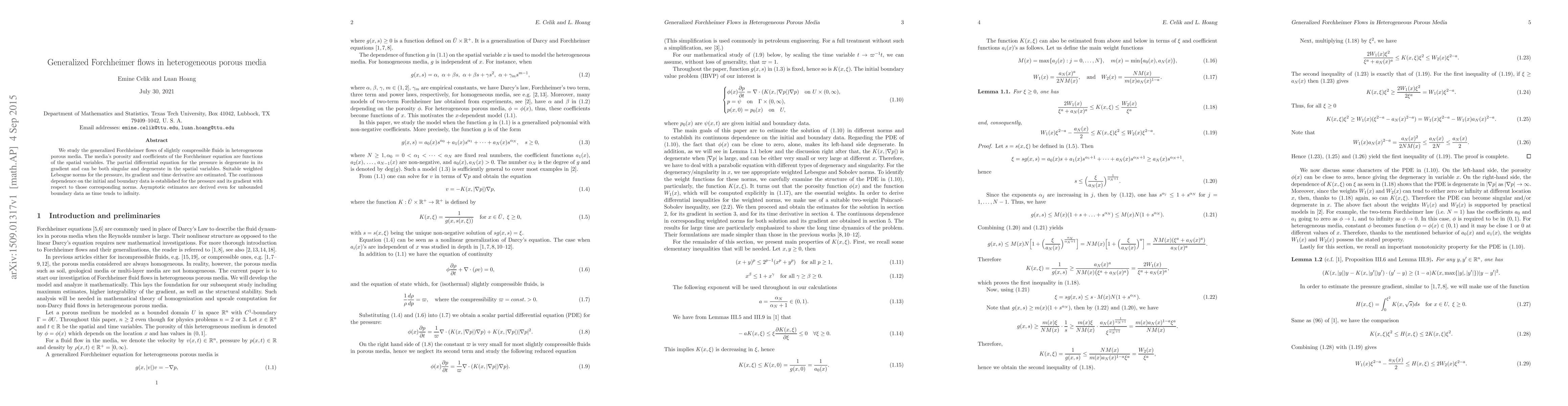 We study the generalized Forchheimer flows of slightly compressible fluids in heterogeneous porous media. The media's porosity and coefficients of the Forchheimer equation are functions of the spatial variables. The partial differential equation for the pressure is degenerate in its gradient and can be both singular and degenerate in the spatial variables. Suitable weighted Lebesgue norms for the pressure, its gradient and time derivative are estimated. The continuous dependence on the initial and boundary data is established for the pressure and its gradient with respect to those corresponding norms. Asymptotic estimates are derived even for unbounded boundary data as time tends to infinity.