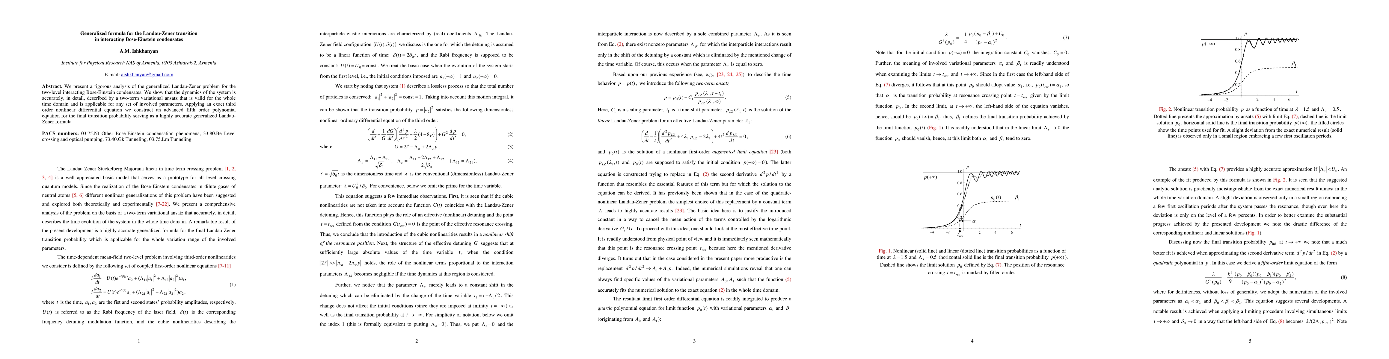 This paper rigorously analyzes the Landau-Zener transition in interacting Bose-Einstein condensates, demonstrating a two-term variational ansatz that accurately describes the system's dynamics. It derives a fifth-order polynomial equation for the transition probability, providing a highly accurate generalized Landau-Zener formula applicable across all parameter sets.