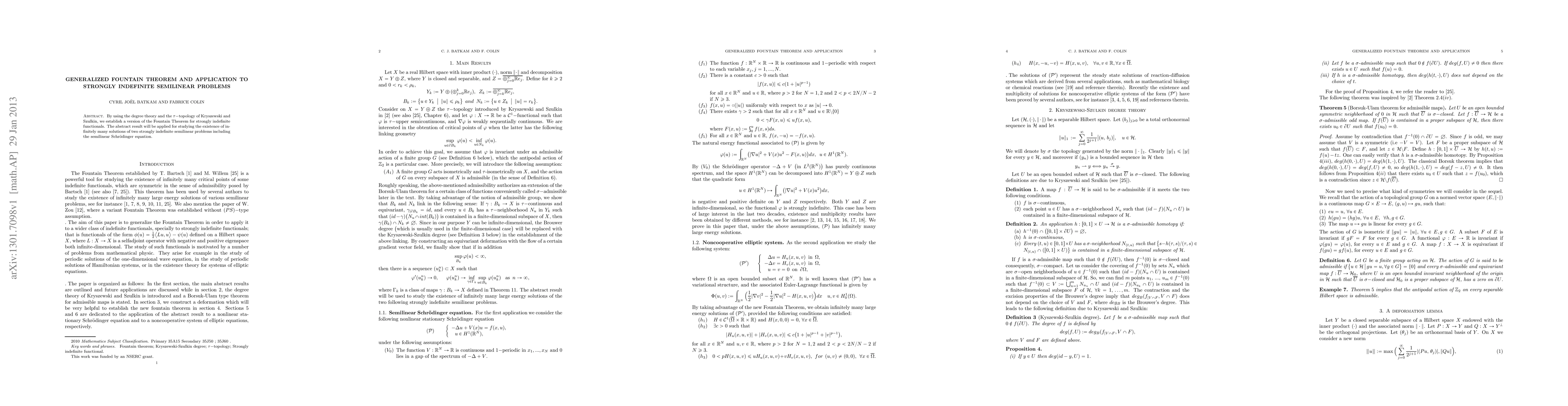 This paper establishes a generalized Fountain Theorem for strongly indefinite functionals using degree theory and $\tau$-topology. The result is then applied to demonstrate the existence of infinitely many solutions for two strongly indefinite semilinear problems, including the semilinear Schrödinger equation.