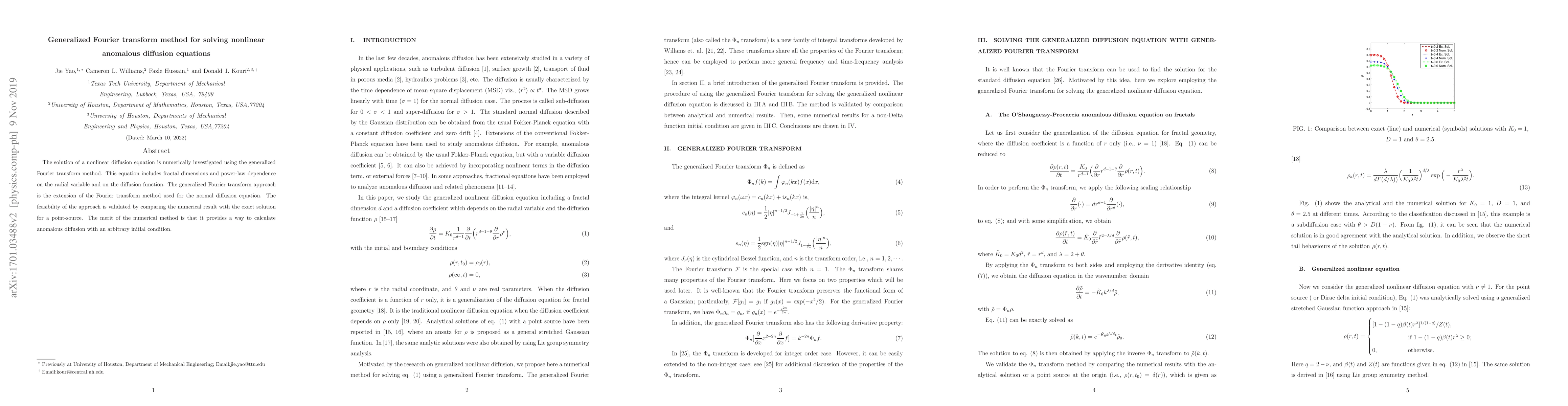 Summary: The paper proposes a generalized Fourier transform method for solving nonlinear anomalous diffusion equations, incorporating fractal dimensions and power-law dependencies. Numerical results are validated against exact solutions, demonstrating the method's capability to handle anomalous diffusion with varied initial conditions.