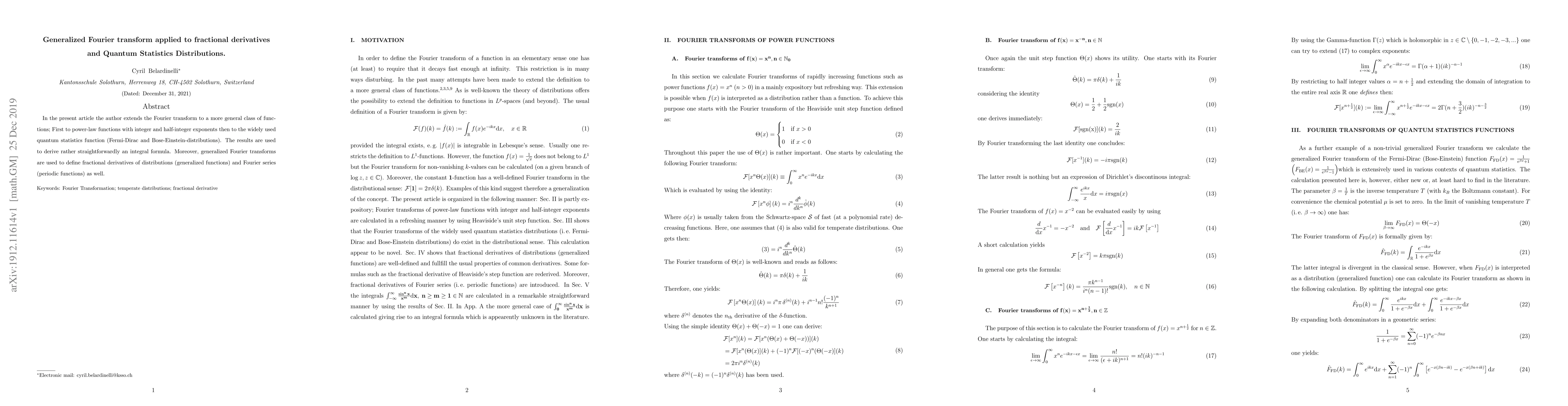 This paper extends the Fourier transform to power-law functions and quantum statistics distributions, deriving an integral formula. It also defines fractional derivatives and Fourier series using generalized Fourier transforms.