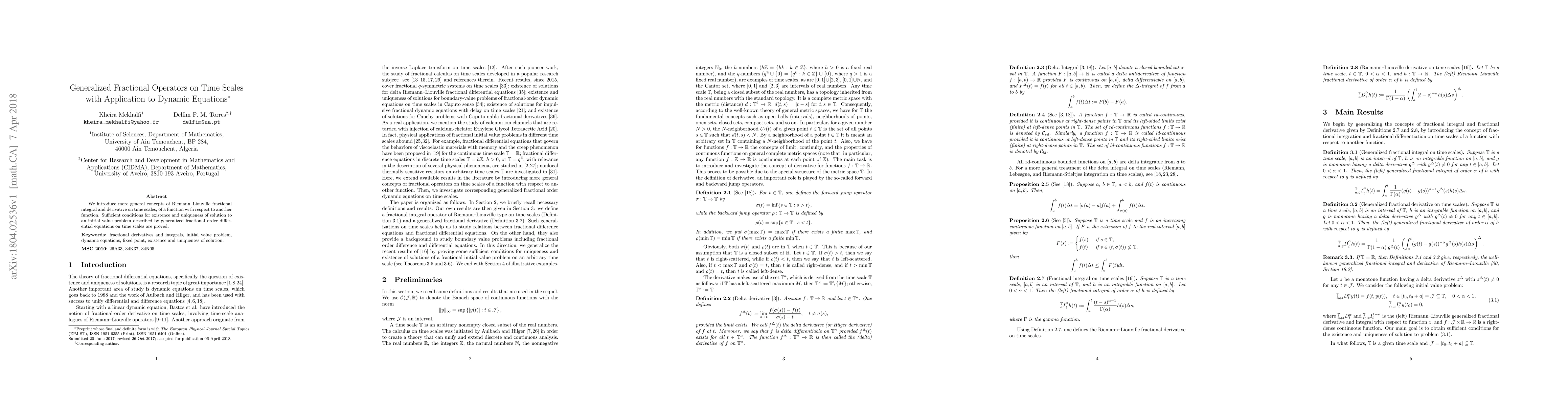 This paper introduces generalized fractional operators on time scales, extending Riemann-Liouville concepts to functions with respect to other functions. It also proves conditions for the existence and uniqueness of solutions to initial value problems involving these generalized fractional differential equations.