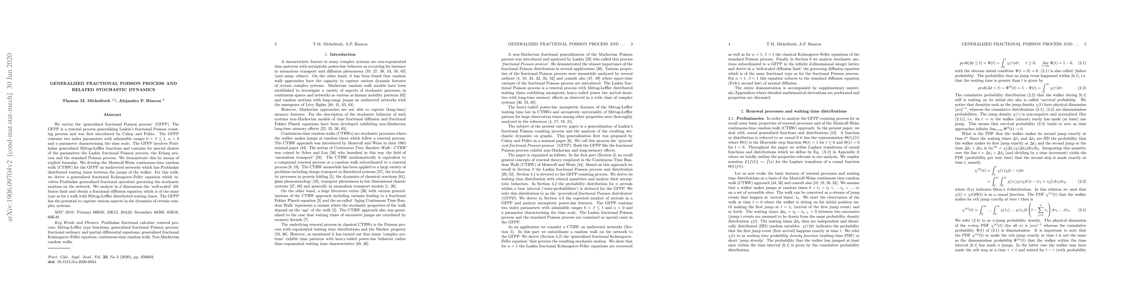 We survey the 'generalized fractional Poisson process' (GFPP). The GFPP is a renewal process generalizing Laskin's fractional Poisson counting process and was first introduced by Cahoy and Polito. The GFPP contains two index parameters with admissible ranges $0<\beta\leq 1$, $\alpha >0$ and a parameter characterizing the time scale. The GFPP involves Prabhakar generalized Mittag-Leffler functions and contains for special choices of the parameters the Laskin fractional Poisson process, the Erlang process and the standard Poisson process. We demonstrate this by means of explicit formulas. We develop the Montroll-Weiss continuous-time random walk (CTRW) for the GFPP on undirected networks which has Prabhakar distributed waiting times between the jumps of the walker. For this walk, we derive a generalized fractional Kolmogorov-Feller equation which involves Prabhakar generalized fractional operators governing the stochastic motions on the network. We analyze in $d$ dimensions the 'well-scaled' diffusion limit and obtain a fractional diffusion equation which is of the same type as for a walk with Mittag-Leffler distributed waiting times. The GFPP has the potential to capture various aspects in the dynamics of certain complex systems.