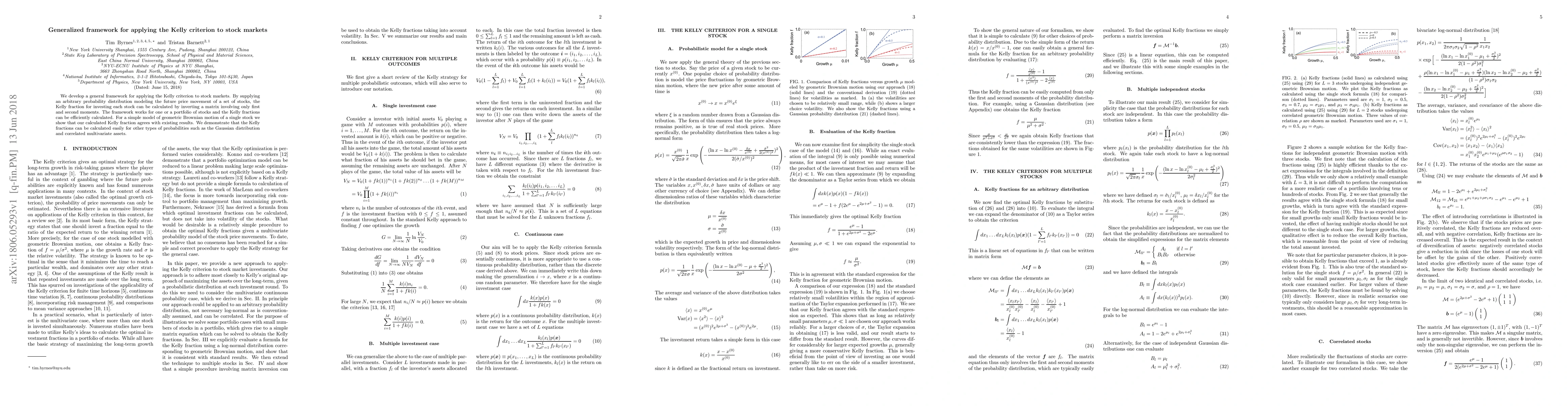 This paper presents a generalized framework for applying the Kelly criterion to stock markets, enabling the calculation of optimal investment fractions for individual stocks or portfolios by inverting a matrix based on first and second moments. The framework is shown to work for various probability distributions and asset types.
