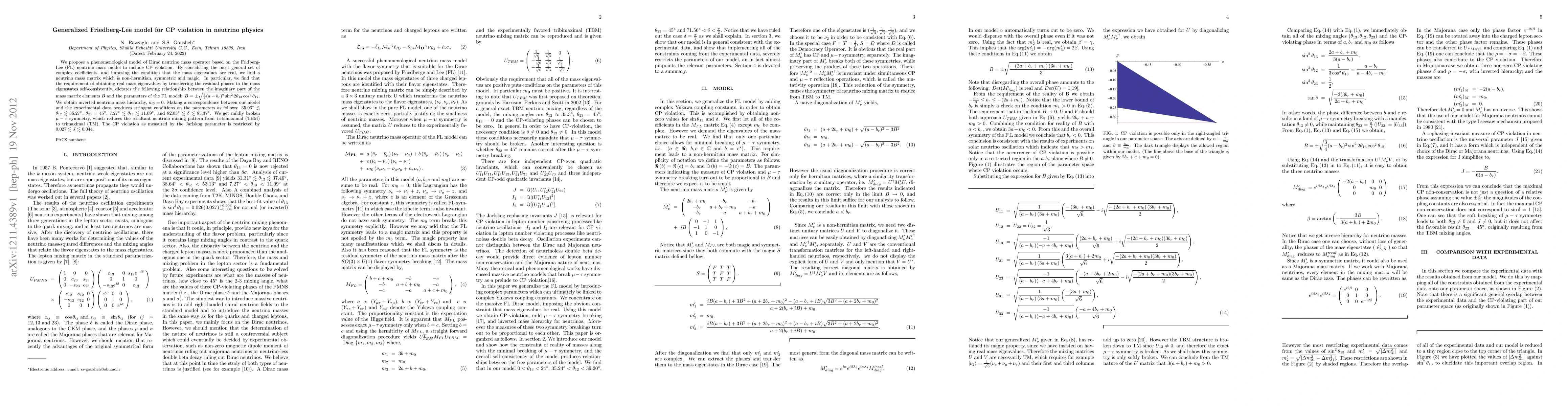 We propose a phenomenological model of Dirac neutrino mass operator based on the Fridberg-Lee (FL) neutrino mass model to include CP violation. By considering the most general set of complex coefficients, and imposing the condition that the mass eigenvalues are real, we find a neutrino mass matrix which is non-hermitian, symmetric and magic. In particular, we find that the requirement of obtaining real mass eigenvalues by transferring the residual phases to the mass eigenstates self-consistently, dictates the following relationship between the imaginary part of the mass matrix elements $B$ and the parameters of the FL model: $B=\pm\sqrt{3/4(a-b_{r})^{2}\sin^{2}2\theta_{13}\cos^{2}\theta_{12}}$. We obtain inverted neutrino mass hierarchy, $m_{3}=0$. Making a correspondence between our model and the experimental data produces stringent conditions on the parameters as follows: $35.06^{\circ}\lesssim\theta_{12}\lesssim36.27^{\circ}$, $\theta_{23}= 45^{\circ}$, $7.27^{\circ}\lesssim\theta_{13}\lesssim11.09^{\circ}$, and $82.03^{\circ}\lesssim\delta\lesssim85.37^{\circ}$. We get mildly broken $\mu-\tau$ symmetry, which reduces the resultant neutrino mixing pattern from tribimaximal (TBM) to trimaximal (TM). The CP violation as measured by the Jarlskog parameter is restricted by $0.027\lesssim J\lesssim0.044$.