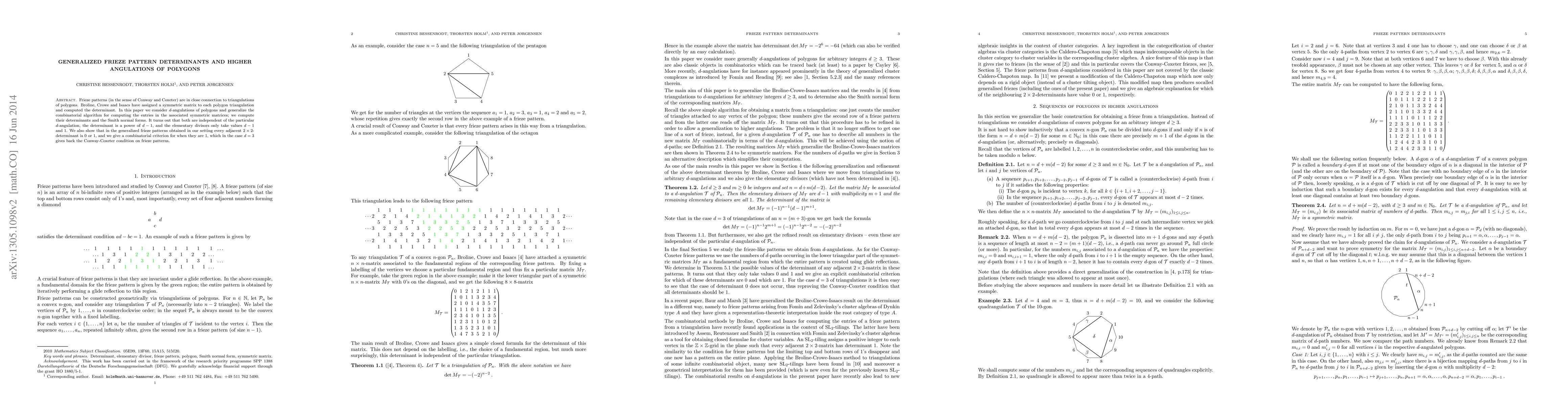 Frieze patterns (in the sense of Conway and Coxeter) are in close connection to triangulations of polygons. Broline, Crowe and Isaacs have assigned a symmetric matrix to each polygon triangulation and computed the determinant. In this paper we consider d-angulations of polygons and generalize the combinatorial algorithm for computing the entries in the associated symmetric matrices; we compute their determinants and the Smith normal forms. It turns out that both are independent of the particular d-angulation, the determinant is a power of d-1, and the elementary divisors only take values d-1 and 1. We also show that in the generalized frieze patterns obtained in our setting every adjacent 2x2-determinant is 0 or 1, and we give a combinatorial criterion for when they are 1, which in the case d=3 gives back the Conway-Coxeter condition on frieze patterns.