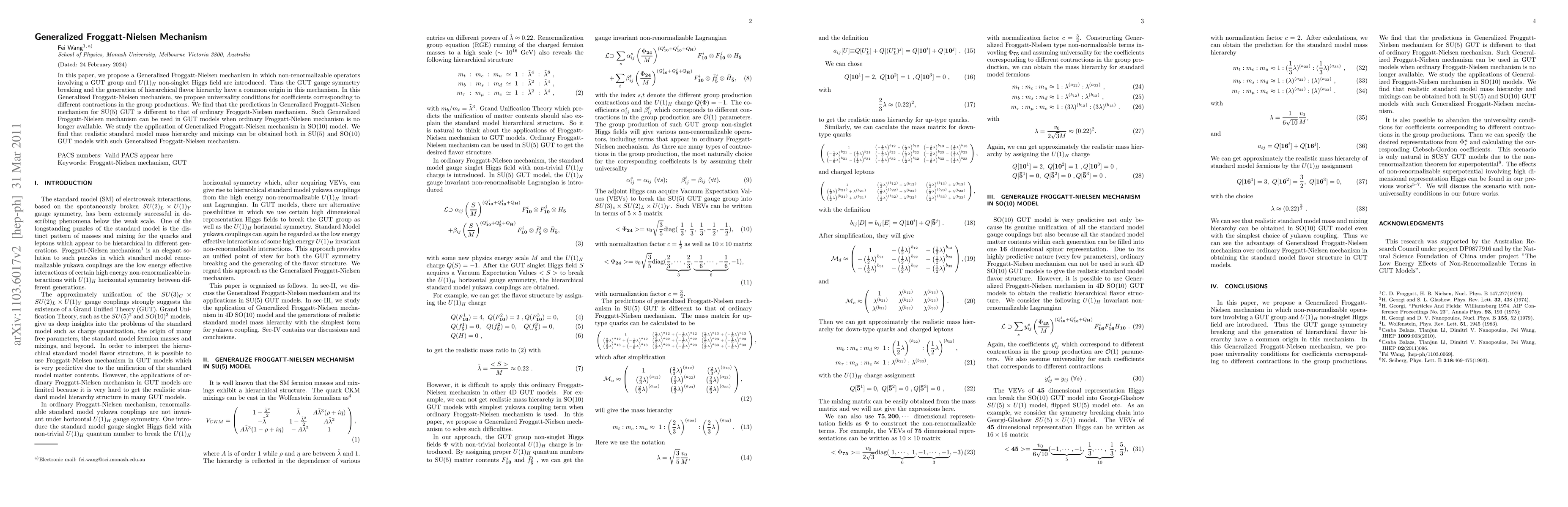 In this paper, we propose a Generalized Froggatt-Nielsen mechanism in which non-renormalizable operators involving a GUT group and $U(1)_H$ non-singlet Higgs field are introduced. Thus the GUT gauge symmetry breaking and the generation of hierarchical flavor hierarchy have a common origin in this mechanism. In this Generalized Froggatt-Nielsen mechanism, we propose universality conditions for coefficients corresponding to different contractions in the group productions. We find that the predictions in Generalized Froggatt-Nielsen mechanism for SU(5) GUT is different to that of ordinary Froggatt-Nielsen mechanism. Such Generalized Froggatt-Nielsen mechanism can be used in GUT models when ordinary Froggatt-Nielsen mechanism is no longer available. We study the application of Generalized Froggatt-Nielsen mechanism in SO(10) model. We find that realistic standard model mass hierarchy and mixings can be obtained both in SU(5) and SO(10) GUT models with such Generalized Froggatt-Nielsen mechanism.