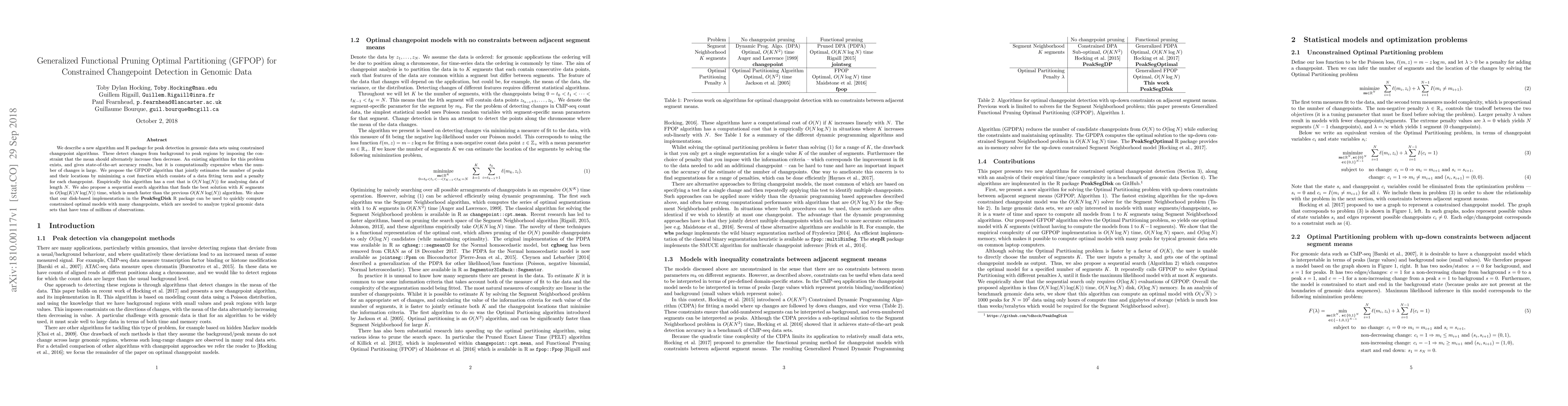 The GFPOP algorithm introduces a new method for detecting peaks in genomic data using constrained changepoint detection, offering a more efficient $O(N \log(N))$ computational cost compared to existing algorithms. The PeakSegDisk R package implements this method, enabling rapid analysis of large genomic datasets with many changepoints.