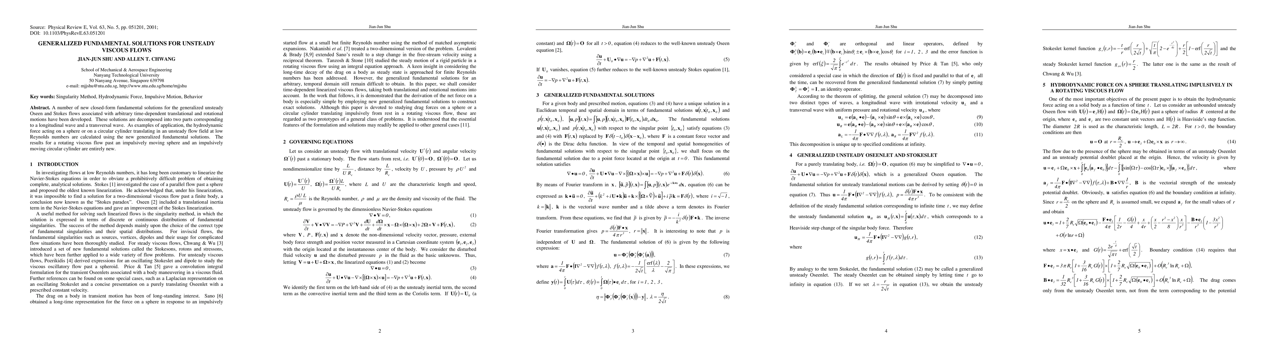 This paper develops new closed-form fundamental solutions for generalized unsteady Oseen and Stokes flows, decomposing them into longitudinal and transversal waves. It applies these solutions to calculate hydrodynamic forces on translating spheres and cylinders at low Reynolds numbers, presenting novel results for rotating viscous flows.