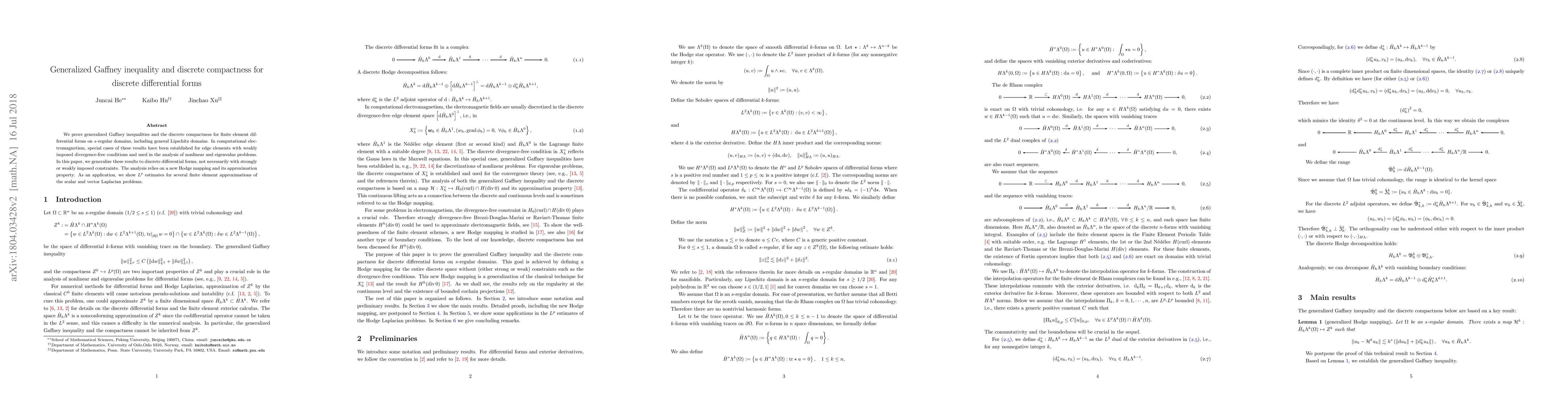 We prove generalized Gaffney inequalities and the discrete compactness for finite element differential forms on $s$-regular domains, including general Lipschitz domains. In computational electromagnetism, special cases of these results have been established for edge elements with weakly imposed divergence-free conditions and used in the analysis of nonlinear and eigenvalue problems. In this paper, we generalize these results to discrete differential forms, not necessarily with strongly or weakly imposed constraints. The analysis relies on a new Hodge mapping and its approximation property. As an application, we show $L^{p}$ estimates for several finite element approximations of the scalar and vector Laplacian problems.