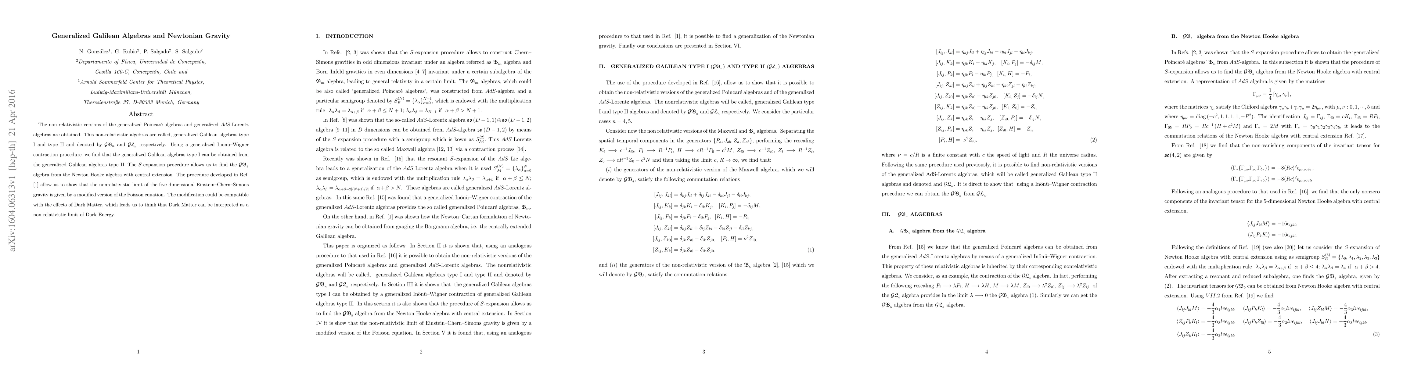 The paper discusses the derivation of generalized Galilean algebras from non-relativistic Poincaré and AdS-Lorentz algebras, revealing their connection through an Inönü-Wigner contraction. It suggests a modified Poisson equation from the non-relativistic limit of five-dimensional Einstein-Chern-Simons gravity, potentially explaining Dark Matter effects.