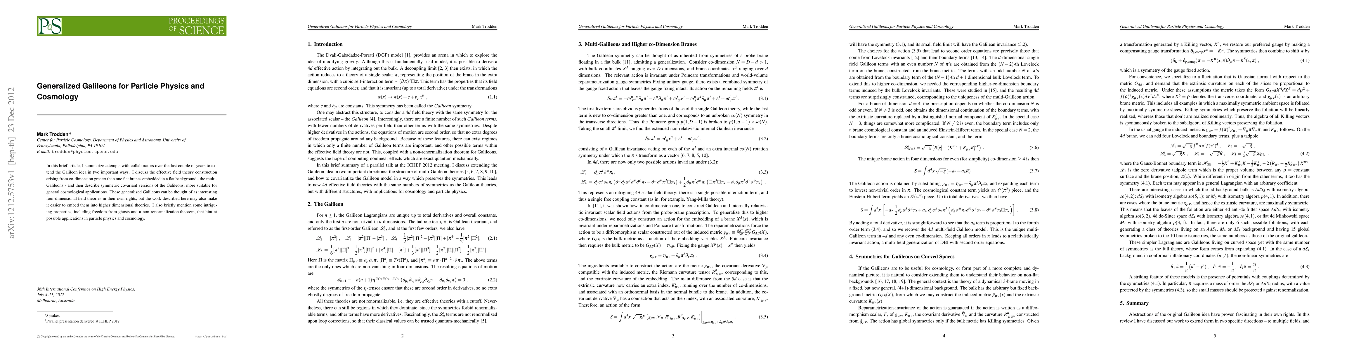 In this brief article, I summarize attempts with collaborators over the last couple of years to extend the Galileon idea in two important ways. I discuss the effective field theory construction arising from co-dimension greater than one flat branes embedded in a flat background - the multi-Galileons - and then describe symmetric covariant versions of the Galileons, more suitable for general cosmological applications. These generalized Galileons can be thought of as interesting four-dimensional field theories in their own rights, but the work described here may also make it easier to embed them into higher dimensional theories. I also briefly mention some intriguing properties, including freedom from ghosts and a non-renormalization theorem, that hint at possible applications in particle physics and cosmology