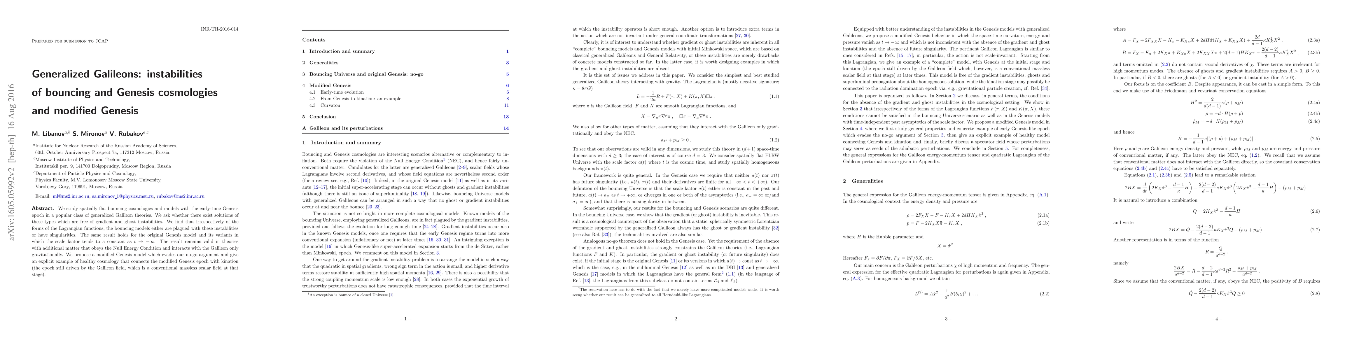 This paper investigates the stability of bouncing and Genesis cosmologies within generalized Galileon theories, finding that these models are often unstable or singular. A modified Genesis model is proposed that avoids these instabilities, providing a viable cosmological scenario.