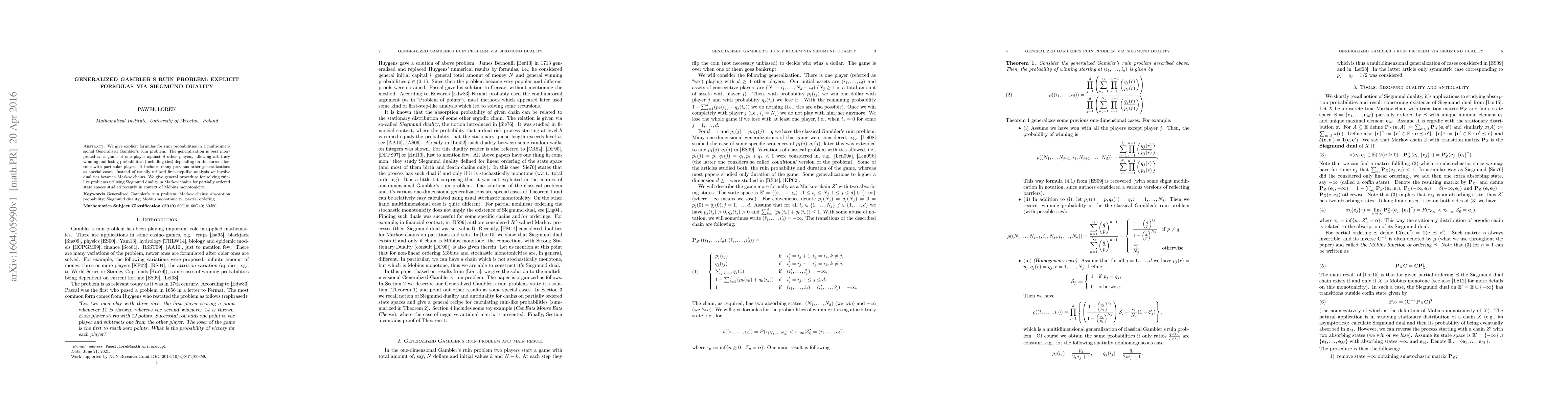 We give explicit formulas for ruin probabilities in a multidimensional Generalized Gambler's ruin problem. The generalization is best interpreted as a game of one player against $d$ other players, allowing arbitrary winning and losing probabilities (including ties) depending on the current fortune with particular player. It includes many previous other generalizations as special cases. Instead of usually utilized first-step-like analysis we involve dualities between Markov chains. We give general procedure for solving ruin-like problems utilizing Siegmund duality in Markov chains for partially ordered state spaces studied recently in context of M\"obius monotonicity.