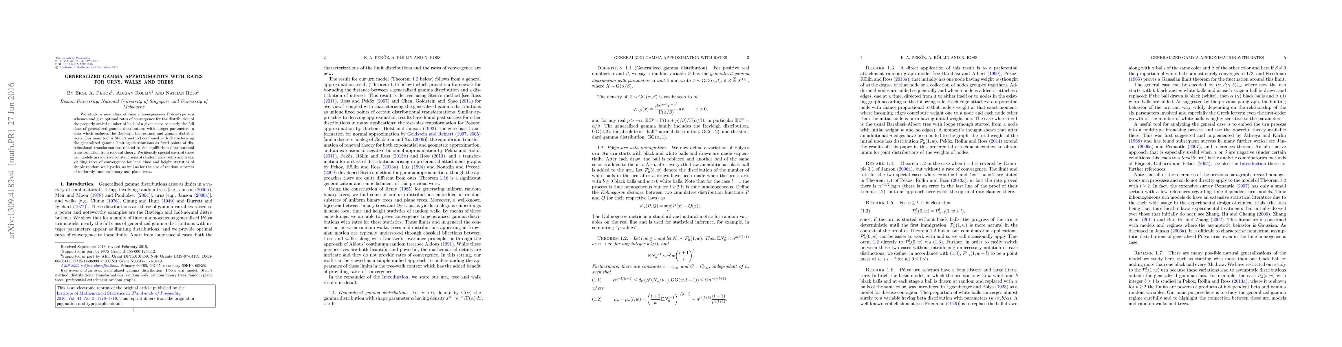 We study a new class of time inhomogeneous P\'olya-type urn schemes and give optimal rates of convergence for the distribution of the properly scaled number of balls of a given color to nearly the full class of generalized gamma distributions with integer parameters, a class which includes the Rayleigh, half-normal and gamma distributions. Our main tool is Stein's method combined with characterizing the generalized gamma limiting distributions as fixed points of distributional transformations related to the equilibrium distributional transformation from renewal theory. We identify special cases of these urn models in recursive constructions of random walk paths and trees, yielding rates of convergence for local time and height statistics of simple random walk paths, as well as for the size of random subtrees of uniformly random binary and plane trees.