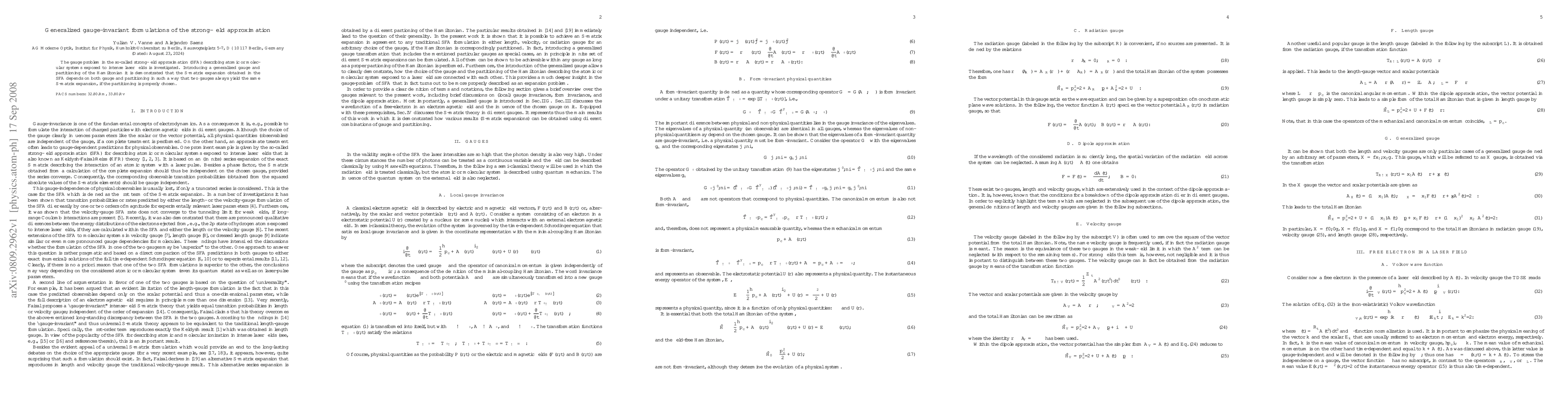 The gauge problem in the so-called strong-field approximation (SFA) describing atomic or molecular systems exposed to intense laser fields is investigated. Introducing a generalized gauge and partitioning of the Hamiltonian it is demonstrated that the S-matrix expansion obtained in the SFA depends on both gauge and partitioning in such a way that two gauges always yield the same S-matrix expansion, if the partitioning is properly chosen.