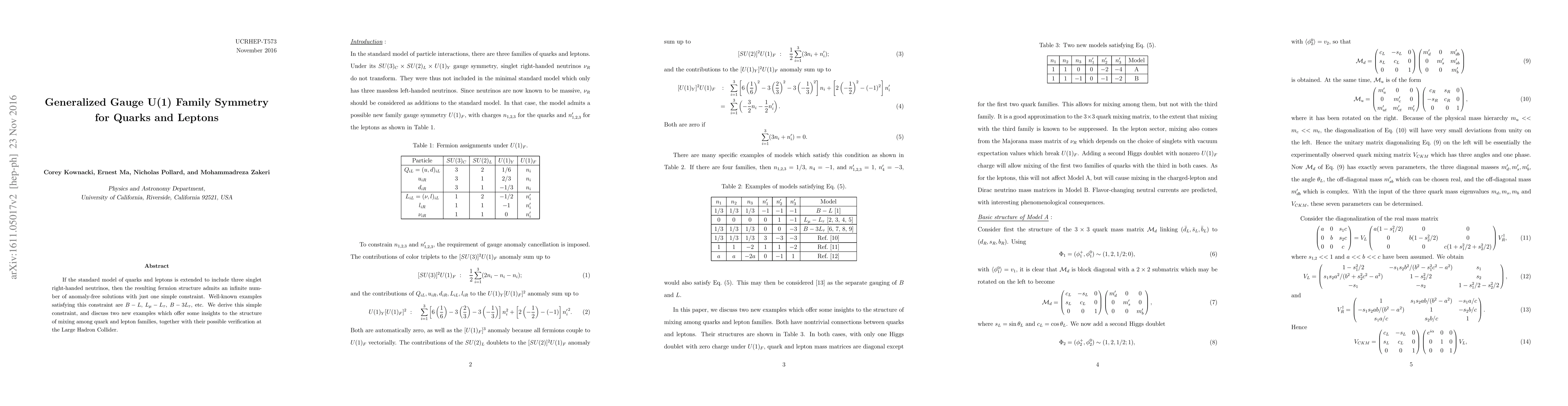 If the standard model of quarks and leptons is extended to include three singlet right-handed neutrinos, then the resulting fermion structure admits an infinite number of anomaly-free solutions with just one simple constraint. Well-known examples satisfying this constraint are $B-L$, $L_{\mu}-L_{\tau}$ , $B-3L_{\tau}$ , etc. We derive this simple constraint, and discuss two new examples which offer some insights to the structure of mixing among quark and lepton families, together with their possible verification at the Large Hadron Collider.