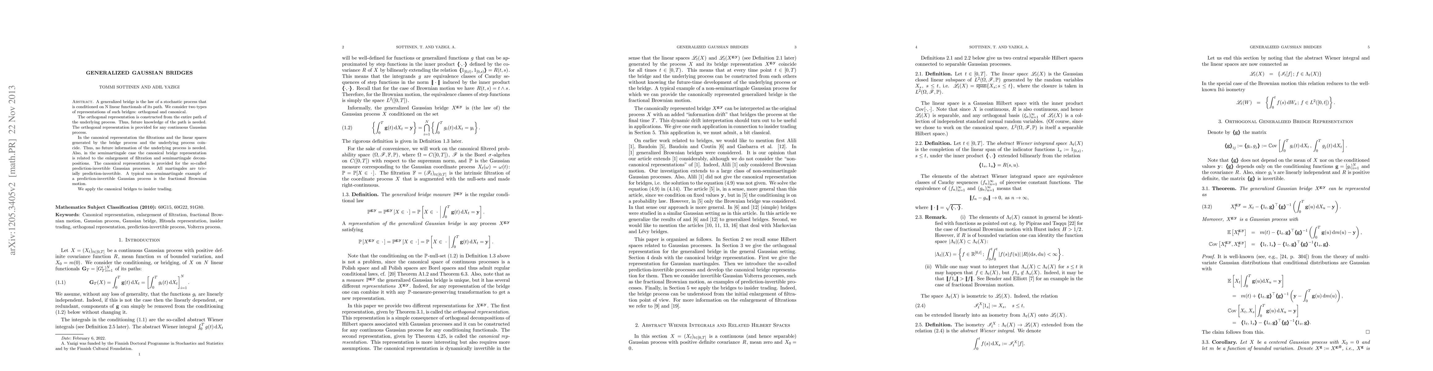 A generalized bridge is the law of a stochastic process that is conditioned on N linear functionals of its path. We consider two types of representations of such bridges: orthogonal and canonical. The orthogonal representation is constructed from the entire path of the underlying process. Thus, future knowledge of the path is needed. The orthogonal representation is provided for any continuous Gaussian process. In the canonical representation the filtrations and the linear spaces generated by the bridge process and the underlying process coincide. Thus, no future information of the underlying process is needed. Also, in the semimartingale case the canonical bridge representation is related to the enlargement of filtration and semimartingale decompositions. The canonical representation is provided for the so-called prediction-invertible Gaussian processes. All martingales are trivially prediction-invertible. A typical non-semimartingale example of a prediction-invertible Gaussian process is the fractional Brownian motion. We apply the canonical bridges to insider trading.