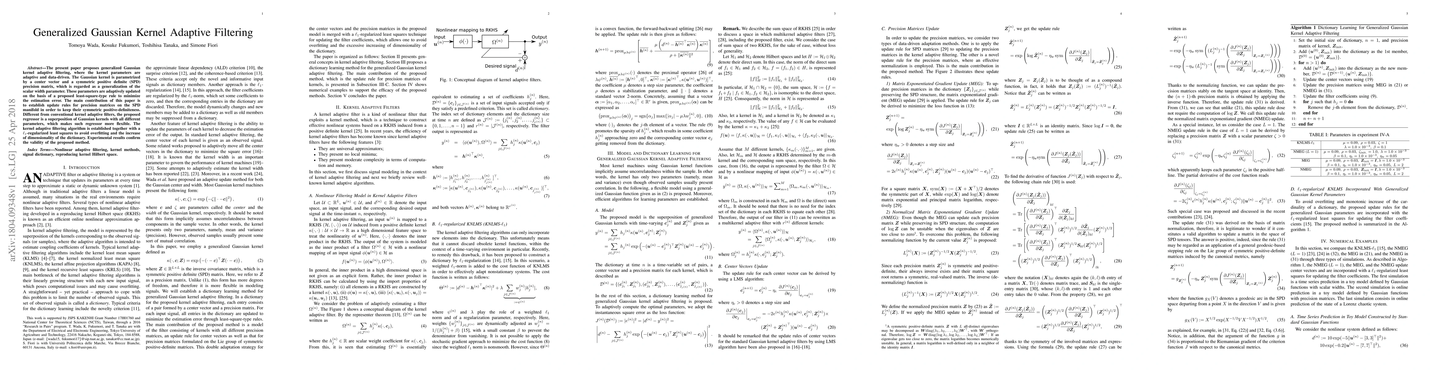 This paper introduces a generalized Gaussian kernel adaptive filtering method with adaptive kernel parameters, focusing on maintaining symmetric positive-definiteness of precision matrices. The proposed algorithm uses a superposition of Gaussian kernels with unique parameters for enhanced flexibility and incorporates l1-regularized least squares to prevent overfitting.