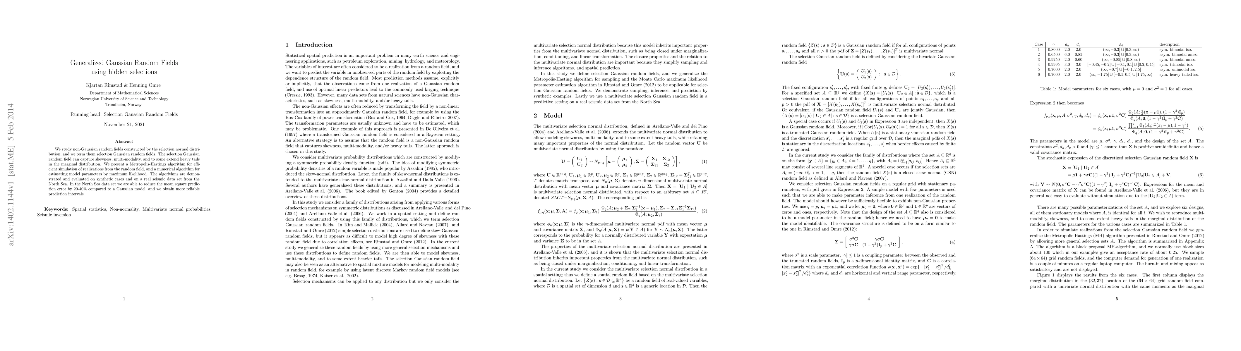 This paper introduces selection Gaussian random fields, which model non-Gaussian distributions with skewness, multi-modality, and heavy tails. It presents a Metropolis-Hastings algorithm for simulation and a maximum likelihood method for parameter estimation, demonstrating improved predictive performance on seismic data from the North Sea.