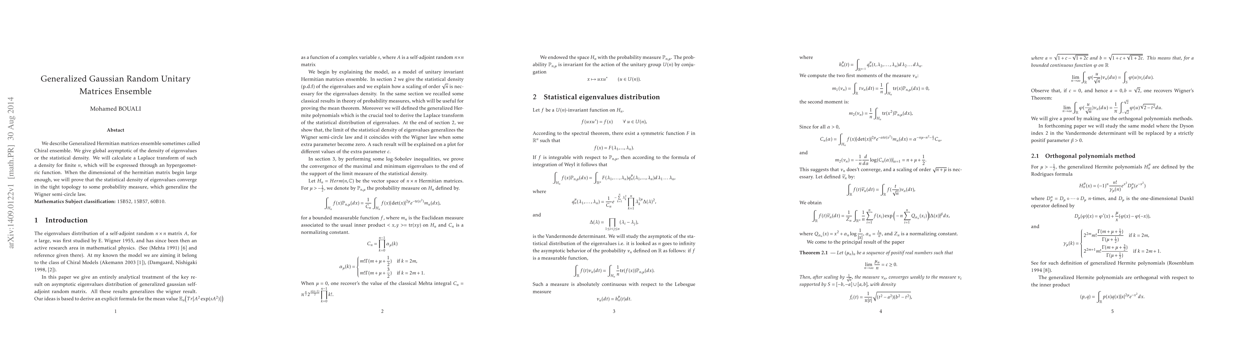 We describe Generalized Hermitian matrices ensemble sometimes called Chiral ensemble. We give global asymptotic of the density of eigenvalues or the statistical density. We will calculate a Laplace transform of such a density for finite $n$, which will be expressed through an hypergeometric function. When the dimensional of the hermitian matrix begin large enough, we will prove that the statistical density of eigenvalues converge in the tight topology to some probability measure, which generalize the Wigner semi-circle law.