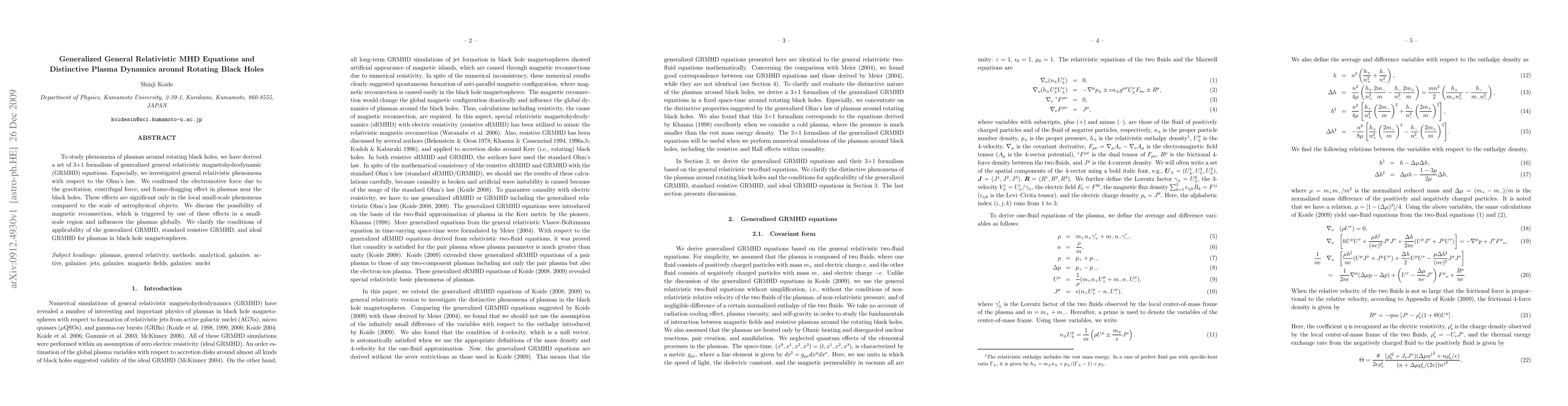 To study phenomena of plasmas around rotating black holes, we have derived a set of 3+1 formalism of generalized general relativistic magnetohydrodynamic (GRMHD) equations. Especially, we investigated general relativistic phenomena with respect to the Ohm's law. We confirmed the electromotive force due to the gravitation, centrifugal force, and frame-dragging effect in plasmas near the black holes. These effects are significant only in the local small-scale phenomena compared to the scale of astrophysical objects. We discuss the possibility of magnetic reconnection, which is triggered by one of these effects in a small-scale region and influences the plasmas globally. We clarify the conditions of applicability of the generalized GRMHD, standard resistive GRMHD, and ideal GRMHD for plasmas in black hole magnetospheres.