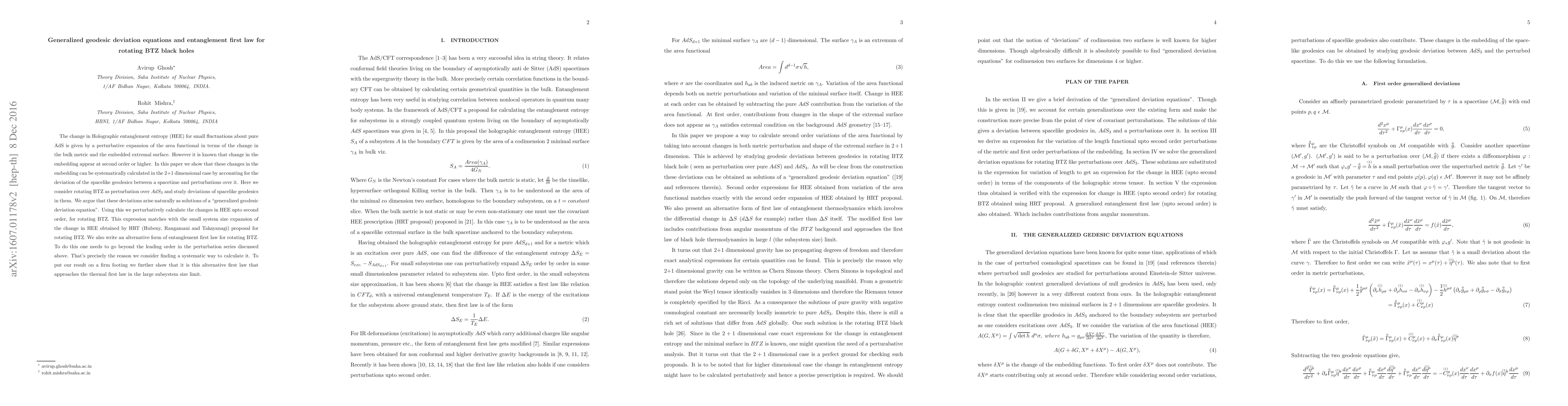 This paper investigates the generalized geodesic deviation equations for rotating BTZ black holes in 2+1 dimensions, showing how these deviations can be used to calculate the change in Holographic entanglement entropy (HEE) up to second order. It also proposes an alternative entanglement first law for rotating BTZ black holes, demonstrating its convergence to the thermal first law in the large subsystem size limit.